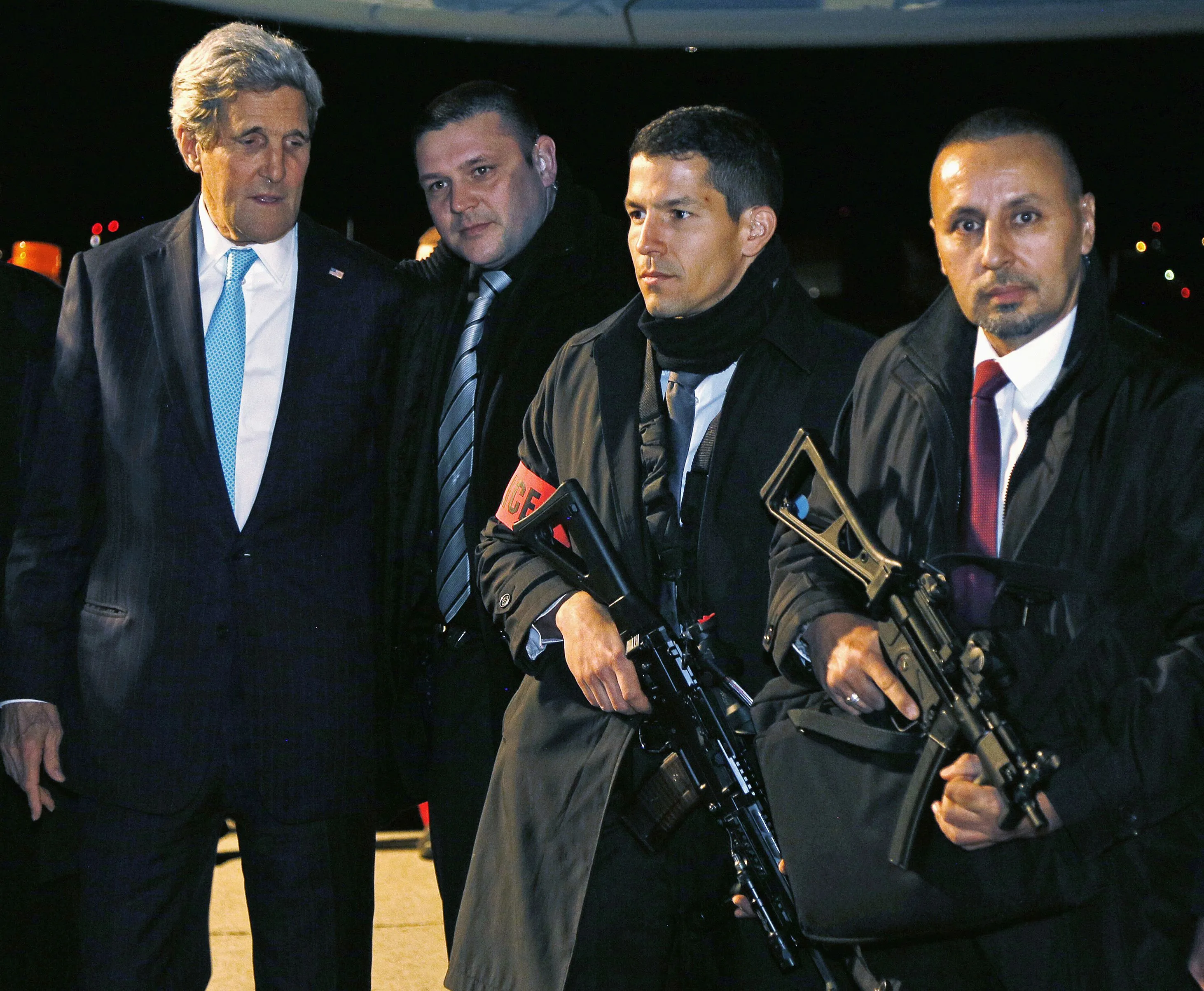 US Secretary of State John Kerry (L) looks over the weapons carried by Swiss police posing for a picture with him as he departs Geneva late on January 14, 2015. Top diplomats from Iran and the United States held “substantive” talks on January 14 aimed at speeding up negotiations for a nuclear deal, with US Secretary of State John Kerry heading back for a surprise new round. (Photo by Rick Wilking/AFP Photo)