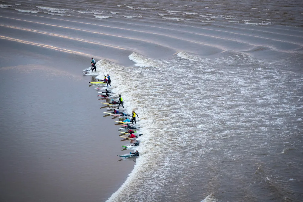 Surfers attempt to ride the Severn Bore as it passes in Newnham on Severn on February 2, 2018 in Gloucestershire, England. The bore, which follows this week's super moon and was given a four-star rating as it is likely to be one of the largest in 2018, attracts surfers from around the world to ride it. The Severn bore, a natural tidal phenomenon and one of the largest in the world, pushes a 4ft wave up the Severn Estuary and is at its most dramatic in the spring when the tides are at their highest. (Photo by Matt Cardy/Getty Images)