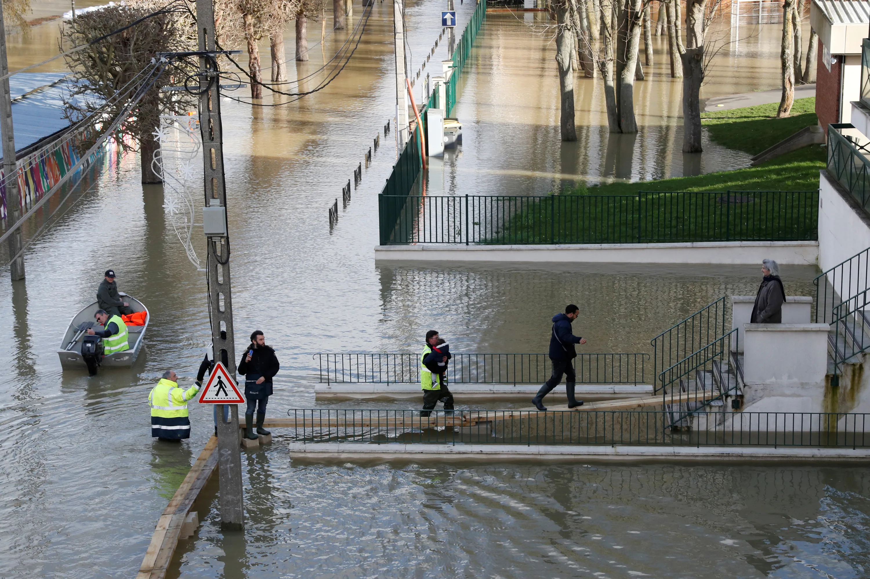 Municipal employees assists residents who walk on elevated boards as the Marne River overflows its banks in Gournay-sur-Marne, near Paris on February 2, 2018. (Photo by Gonzalo Fuentes/Reuters)