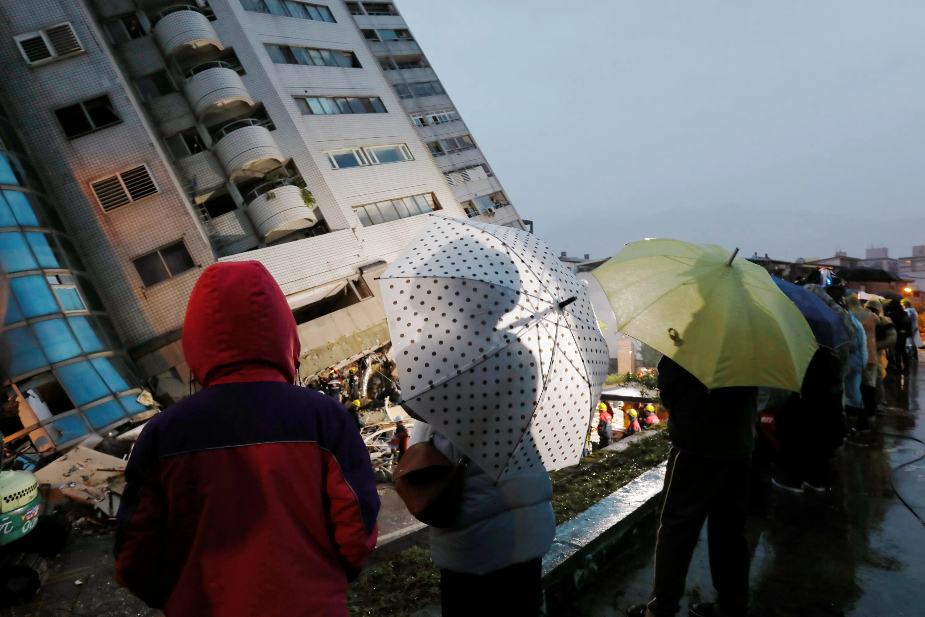 People look at a damaged residential building in Hualien, Taiwan February 7, 2018. (Photo by Tyrone Siu/Reuters)