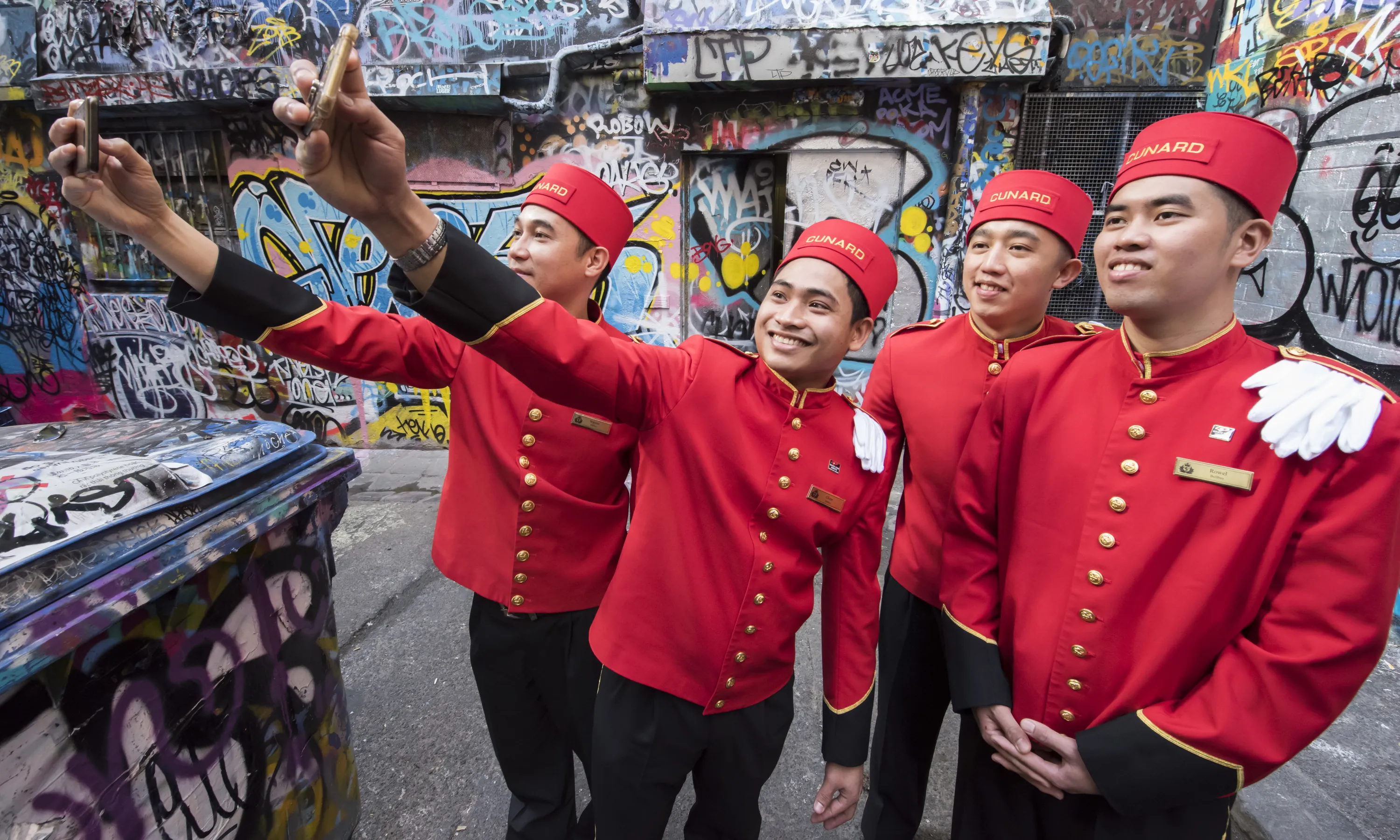 The world famous bell boys from the luxury cruise line Cunard sightseeing in graffiti lanways in the CBD on February 18, 2018 in Melbourne, Australia. Cunard today announced that their ship, Queen Elizabeth, will be based in the Victorian capital for a record two months over the 2019-20 summer, as part of an unprecendented 101 day season “Down Under” in Australia for the iconic ship. (Photo by James D. Morgan/Getty Images)
