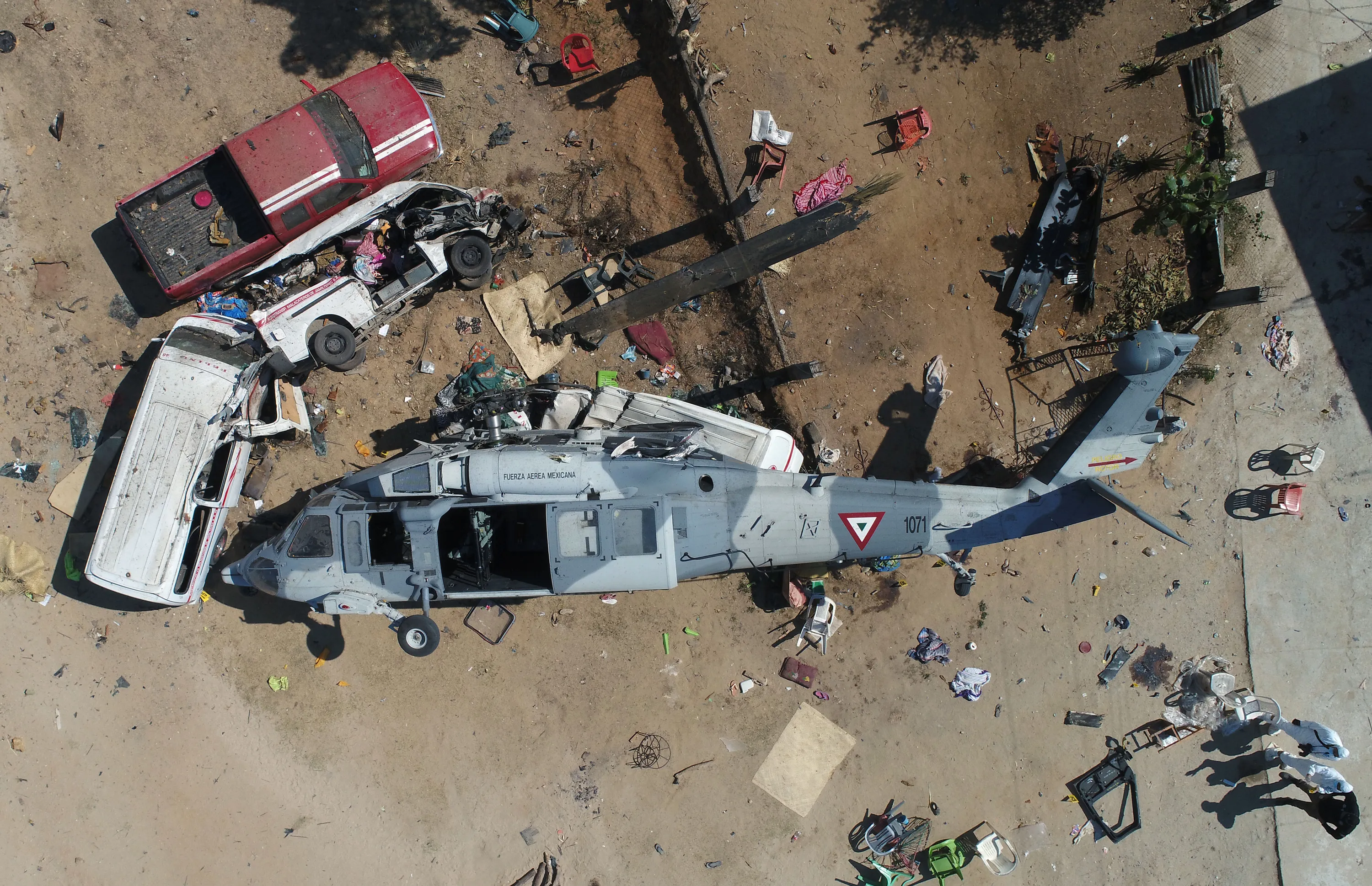 Aerial view of the military helicopter that fell on a van in Santiago Jamiltepec, Oaxaca state, Mexico, on February 17, 2018. A 7.2-magnitude earthquake rattled Mexico on Friday, causing little damage but triggering a tragedy when a minister's helicopter crash-landed on the way to the epicenter, Oaxaca, killing thirteen people, including three children, on the ground. (Photo by Mario Vazquez/AFP Photo)