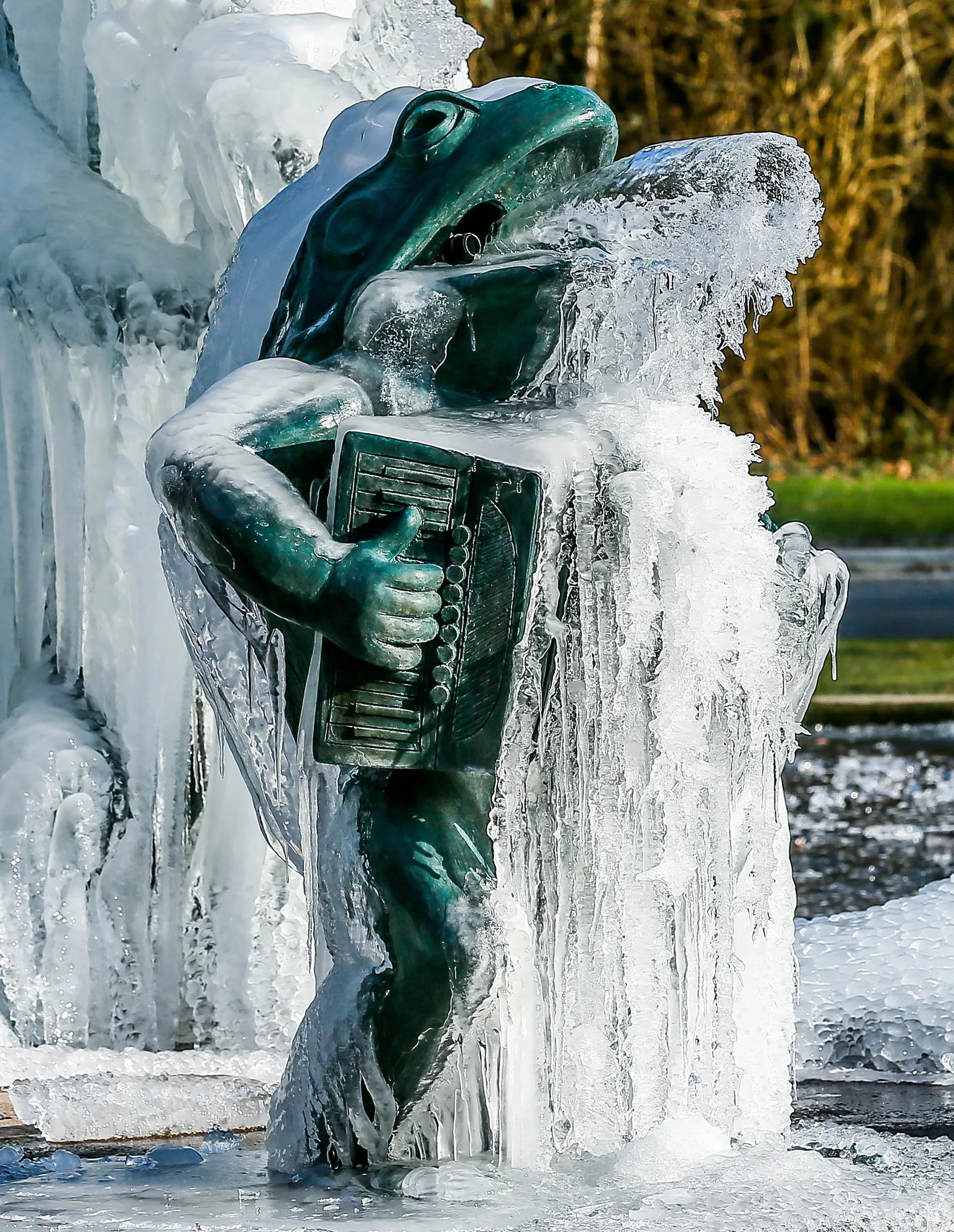 A view of the frozen fountain 'Bandundu Water Jazz Band' of the artist Tom Frantzen next to the Central African Museum in Tervuren near Brussels, Belgium, 27 February 2018. Media reports state that extreme cold weather is forecast to hit many parts of Europe with temperatures plummeting to a possible ten year low. (Photo by Stephanie LeCocq/EPA/EFE)