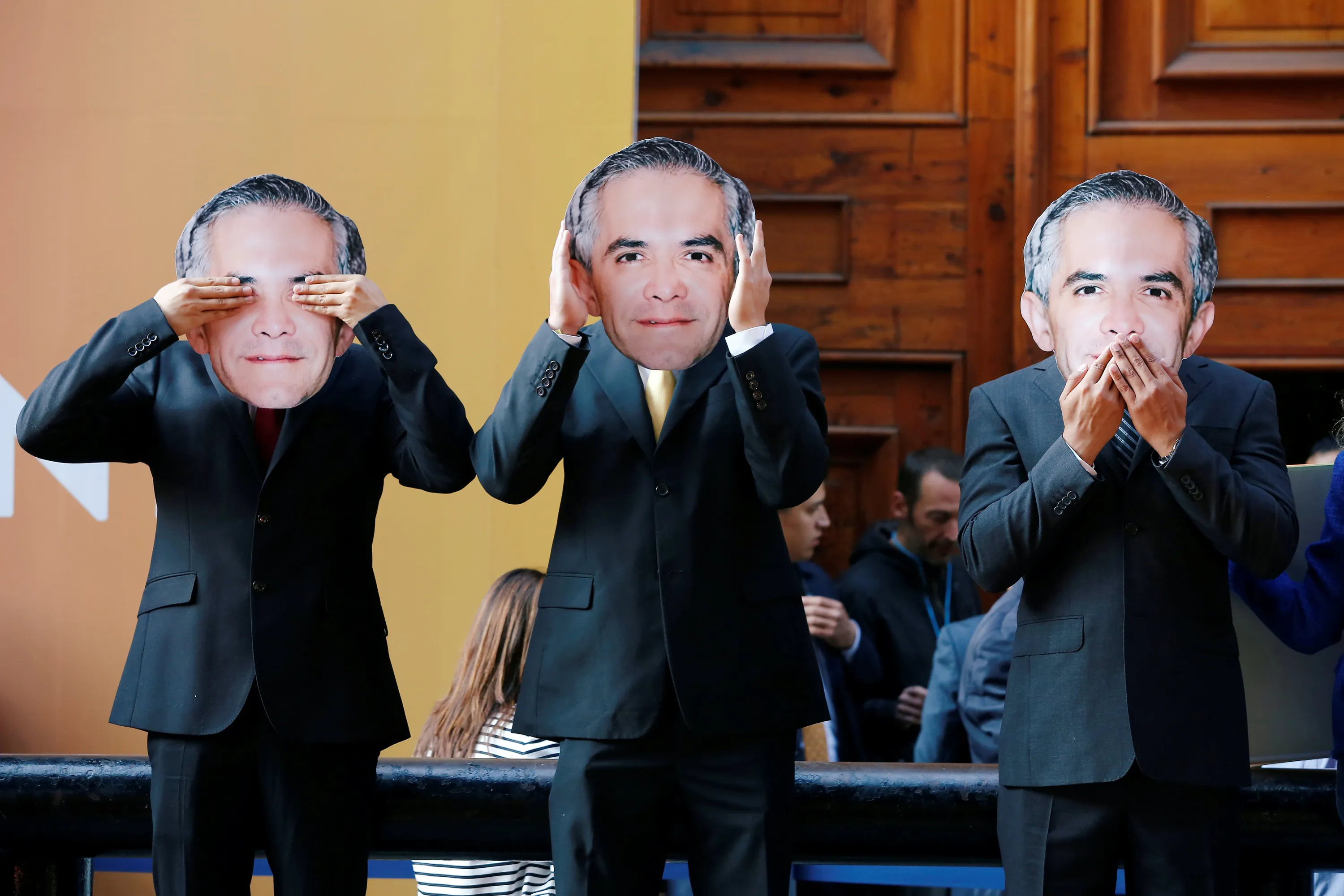 Greenpeace activists gesture while wearing masks of Mexico City's mayor Miguel Angel Mancera during a protest outside the museum holding the Women4Climate conference in Mexico City, Mexico February 26, 2018. (Photo by Ginnette Riquelme/Reuters)