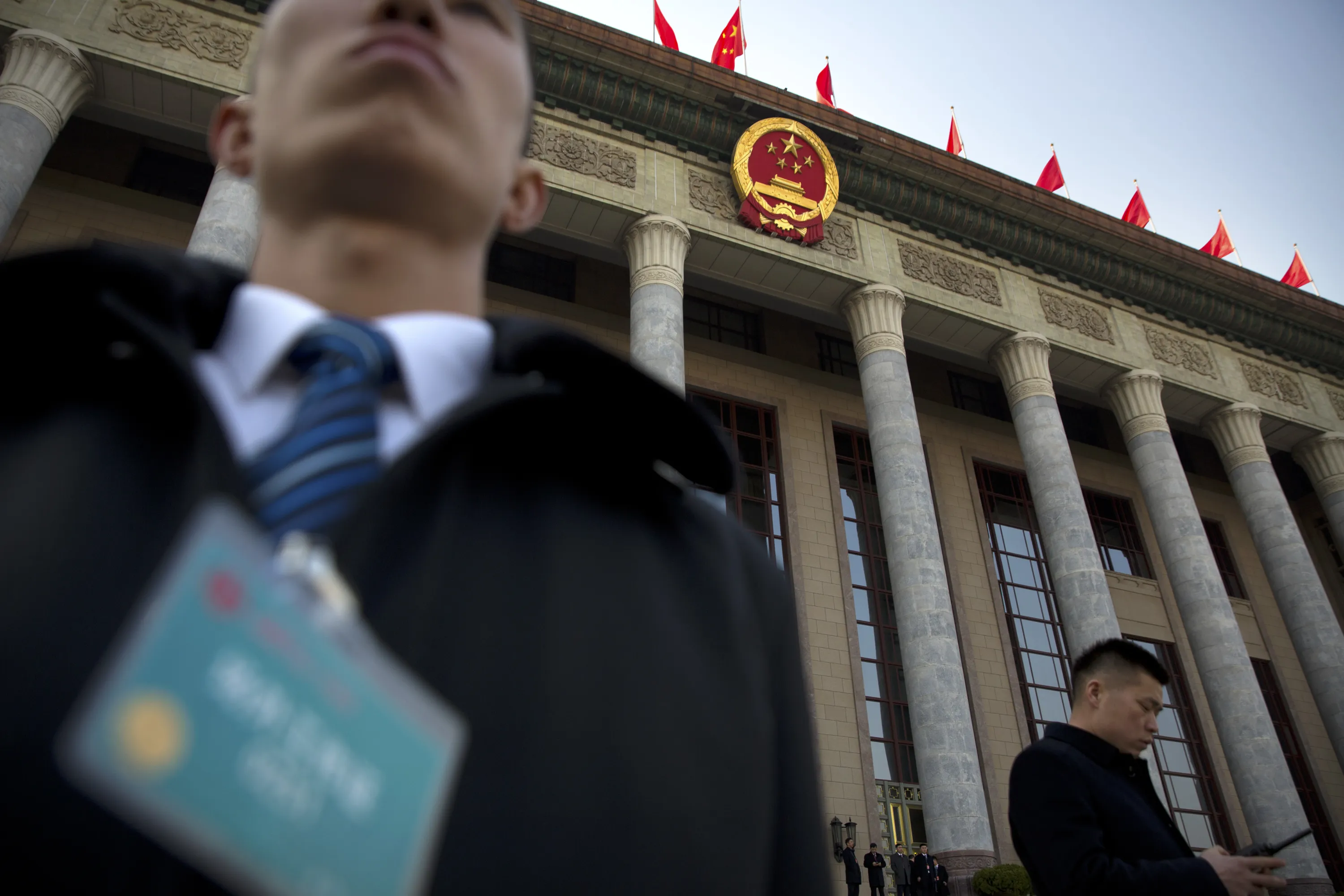 Security personnel stand guard outside the Great Hall of the People in Beijing, Friday, March 2, 2018. (Photo by Mark Schiefelbein/AP Photo)