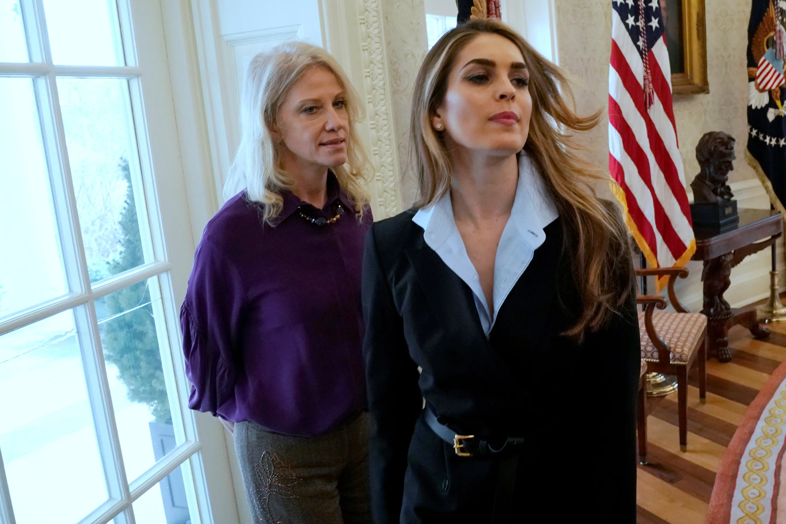 White House Communications Director Hope Hicks (C) departs as she and White House counselor Kellyanne Conway stand on the sidelines while President Donald Trump speaks to reporters in the Oval Office at the White House in Washington, February 9, 2018. (Photo by Jonathan Ernst/Reuters)