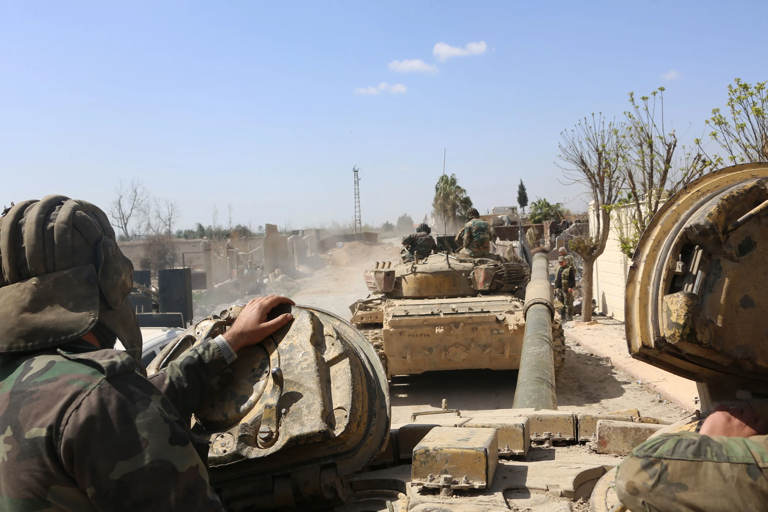 A picture taken on March 11, 2018 shows Syrian government forces outside of the town of Jisreen in the southern tip of the rebel-held Eastern Ghouta enclave as they advance in the area. Defying global calls for a ceasefire, Syria's government has pursued a ferocious Russian-backed air campaign and ground offensive to capture the region, the last rebel bastion on the capital's doorstep. (Photo by AFP Photo/Stringer)