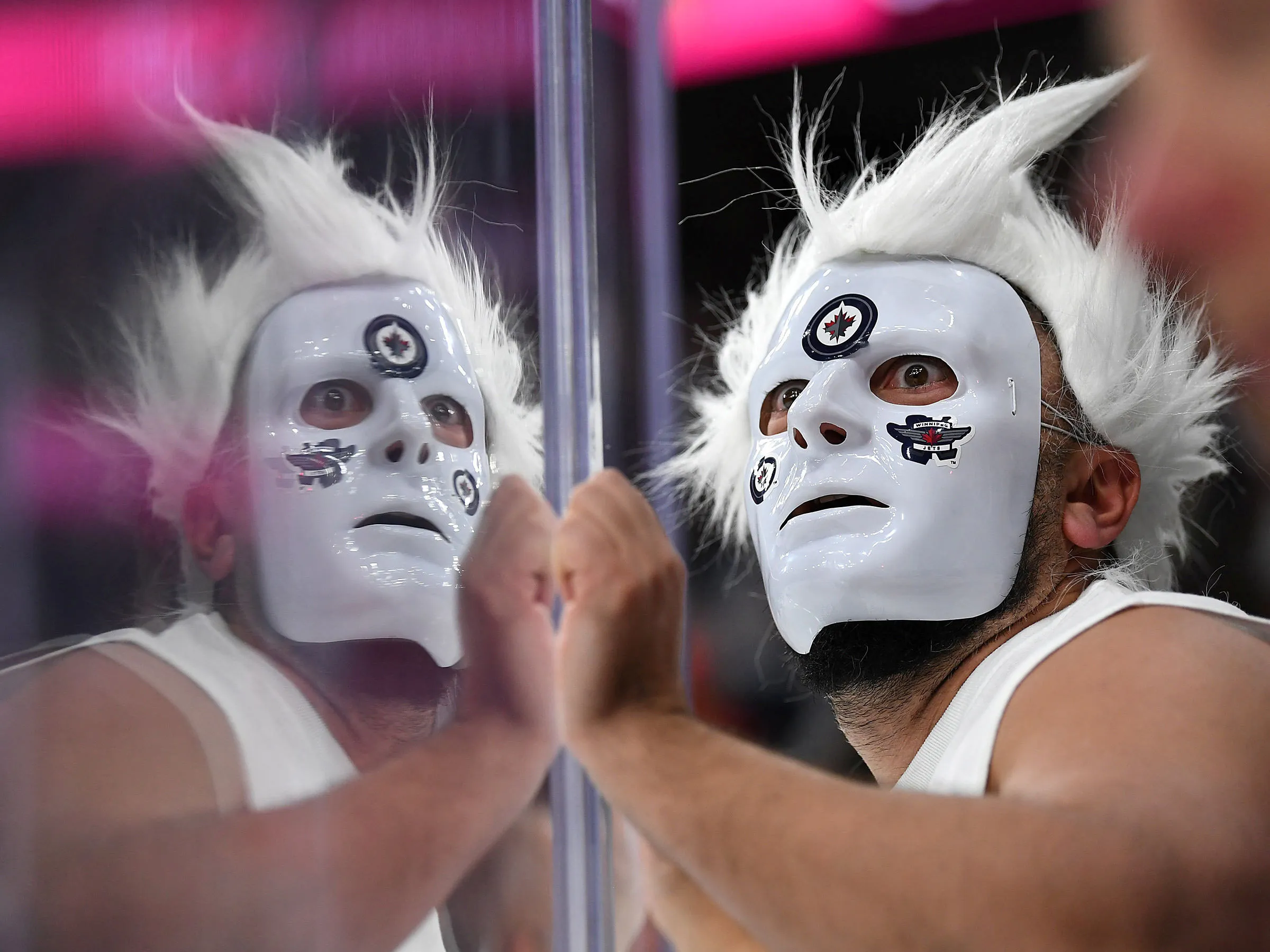 A fan of the Winnipeg Jets is reflected in the glass in the first period in game four of the Western Conference Final of the 2018 Stanley Cup Playoffs against the Vegas Golden Knights at T-Mobile Arena in Las Vegas, NV, USA on May 18, 2018. (Photo by Stephen R. Sylvanie/USA TODAY Sports)