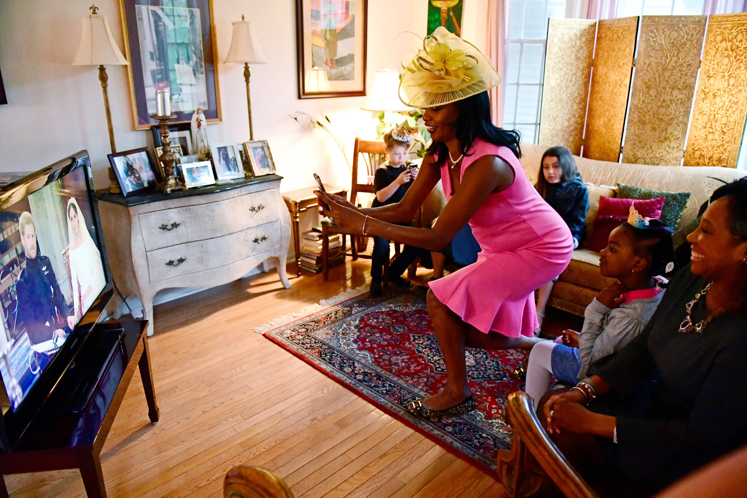 Jenice Armstrong of Burlington, N.J. takes a photo during a television viewing party of the royal wedding of Meghan Markle and Prince Harry , Saturday, May 18, 2018, at the Armstrong-Turner residence in Burlington, N.J. From pubgoers in pajamas to merrymakers in finery at a posh hotel, Americans cheered and teared up Saturday as they watched Meghan Markle marry Prince Harry in a royal wedding with trans-Atlantic resonance. (Photo by Corey Perrine/AP Photo)