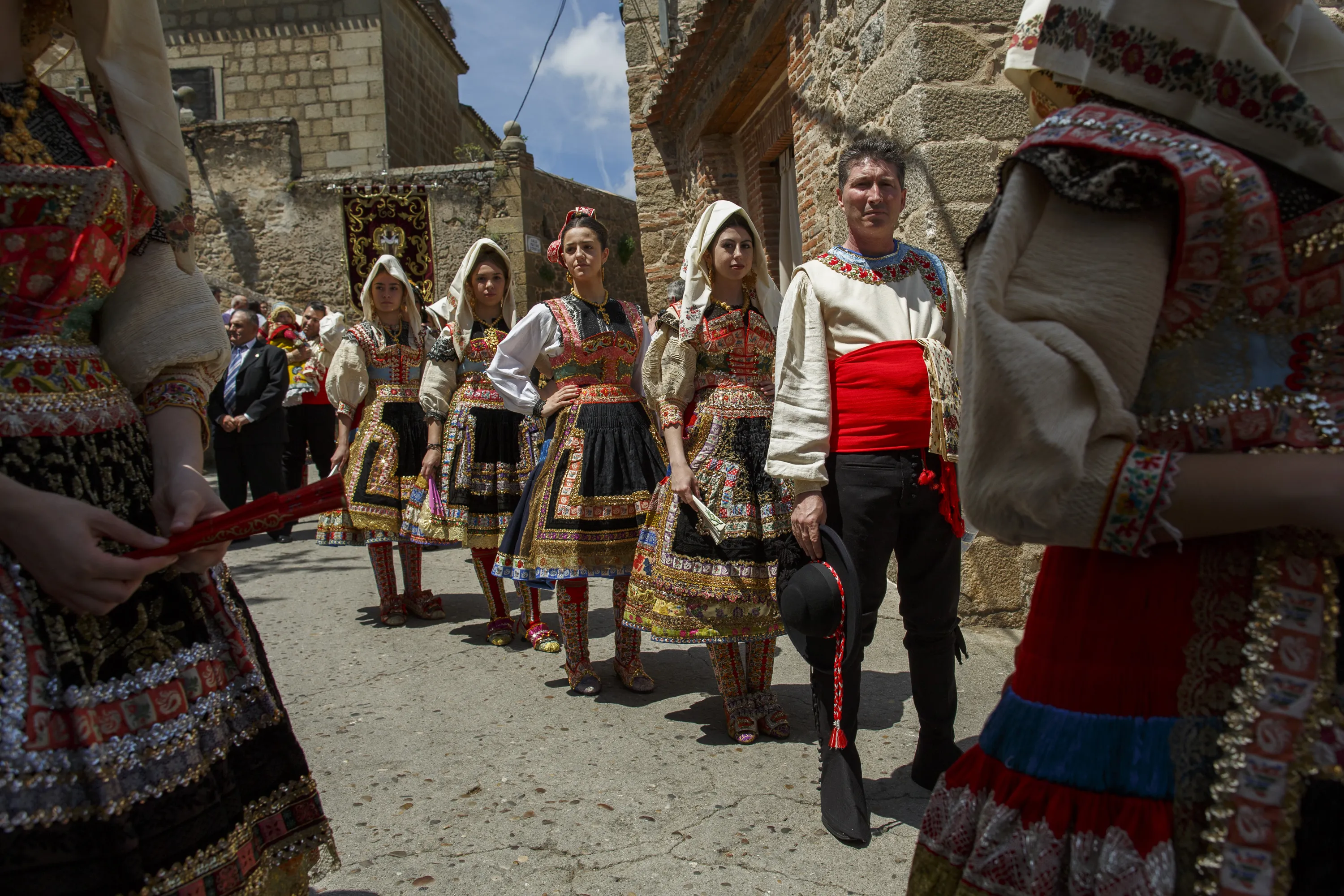 Women wear the traditional costumes of “Lagarteranas” and a man take part on the Corpus Christi procession on June 3, 2018 in Lagartera, in Toledo province, Spain. The Corpus Christi procession of Lagartera throws back to 1590. Before the procession, villagers decorate the streets with embroidered blankets and clothes, and place altars with Baroque carvings of the baby Jesus. Some blankets have been passed down from generation to generation since XVI century. Women dress in colorful, embroidered, traditional costumes. (Photo by Pablo Blazquez Dominguez/Getty Images)