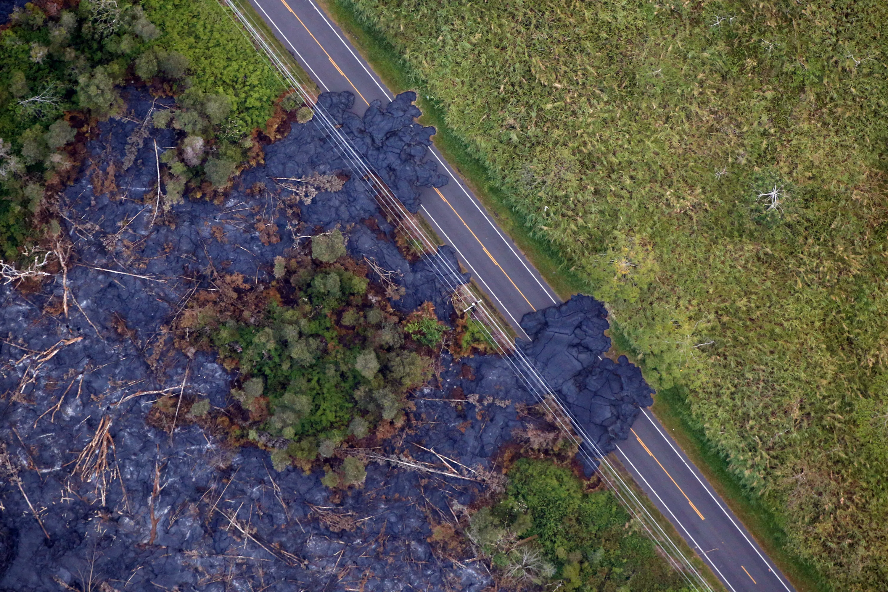 Lava flows across a highway on the outskirts of Pahoa during ongoing eruptions of the Kilauea Volcano in Hawaii, U.S., June 5, 2018. (Photo by Terray Sylvester/Reuters)