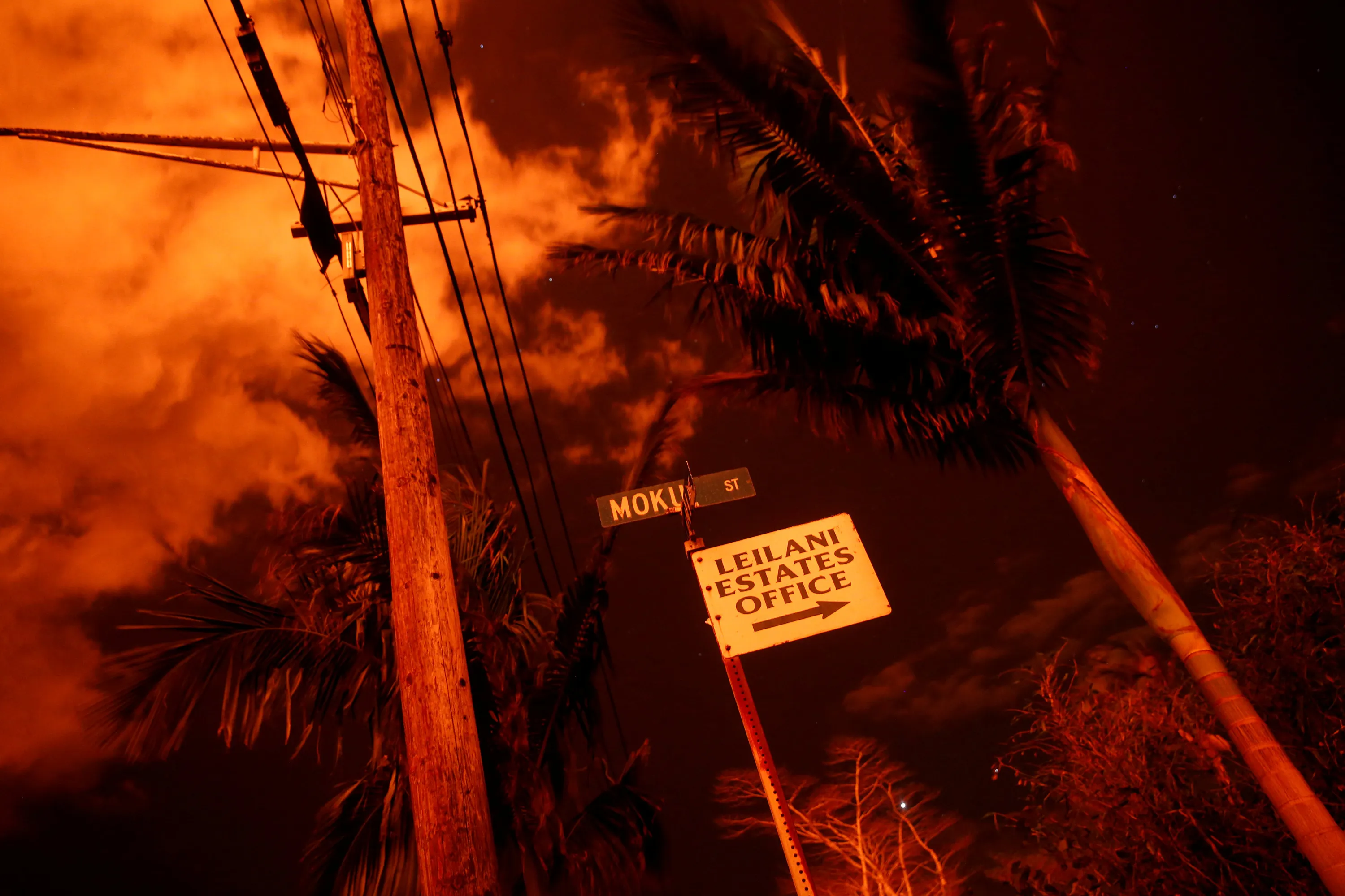 Lava illuminates a sign in Leilani Estates during ongoing eruptions of the Kilauea Volcano in Hawaii, U.S., June 9, 2018. (Photo by Terray Sylvester/Reuters)