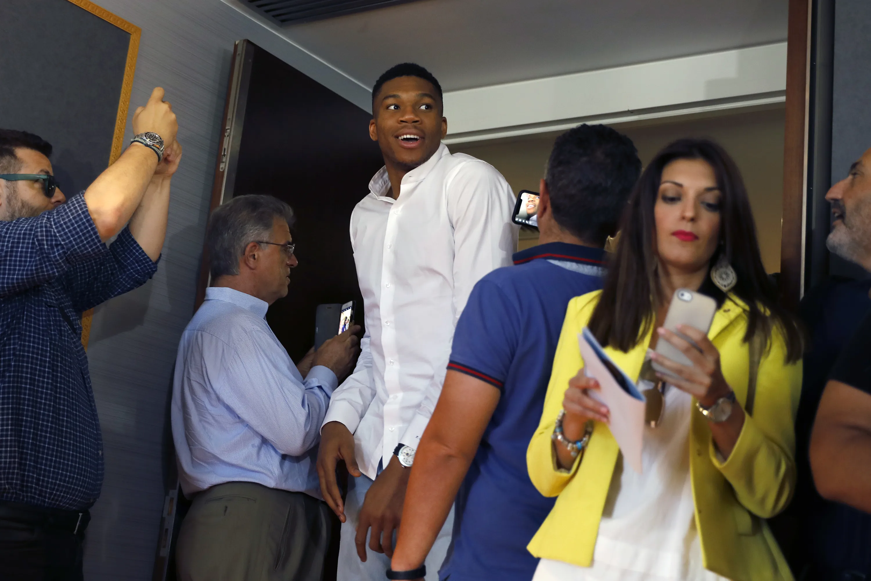 NBA star Giannis Antetokounmpo arrives to a press conference by Greece's Tourism Ministry to promote his native Greece, in Athens, on Friday, June 29, 2018. Antetokounmpo, whose parents immigrated to Greece from Nigeria, said he always encourages his friends to visit but his favorite part of the country is Athens, where he grew up. (Photo by Petros Giannakouris/AP Photo)