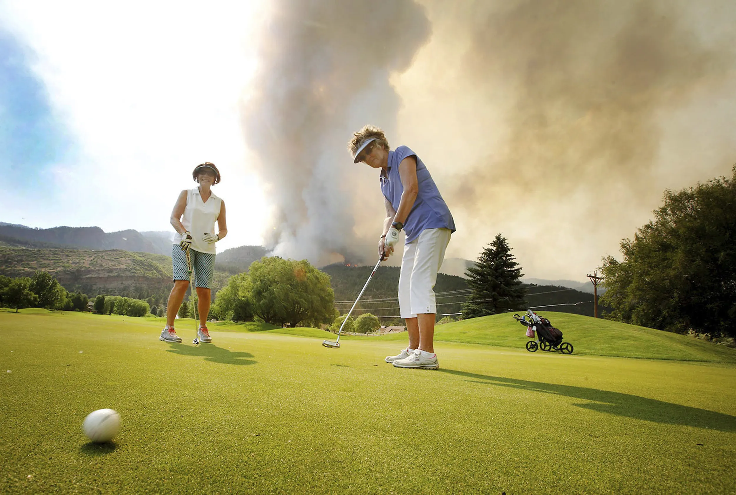 In this Tuesday, June 12, 2018, photograph, Sandy Elliott follows her putt while playing a round of golf with Marlene Gebhardt at Dalton Golf and Country Club with the 416 Fire burning behind them near Durango, Colo. The two ladies are on pre evacuation in Dalton ranch and said we have been looking at the the fire for days and we can't just sit around everyday so they decided to hit the links. (Photo by Jerry McBride/The Durango Herald via AP Photo)