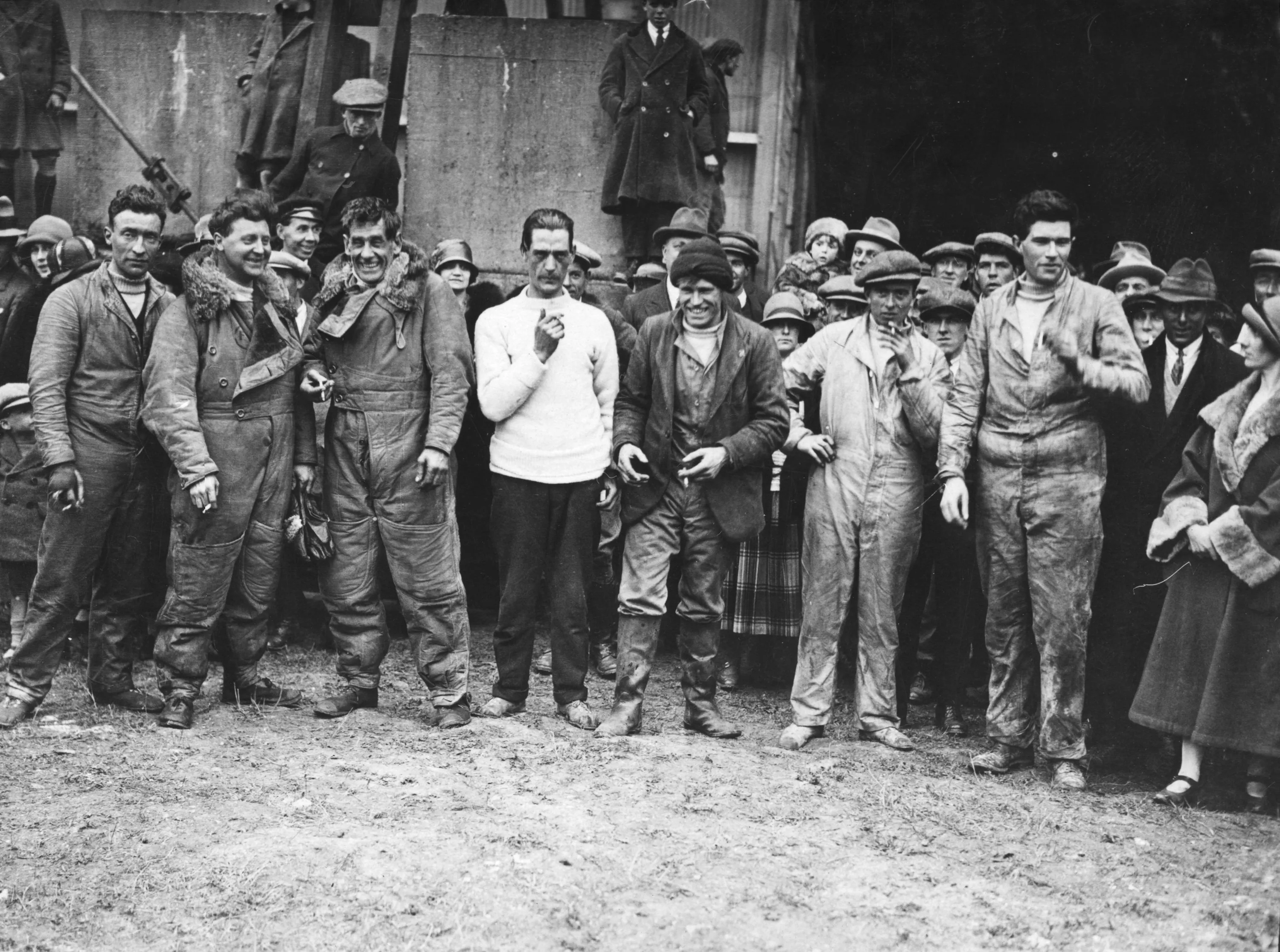 Seven of the crew of the damaged airship R33 (R-33) which managed to struggle back to its arifield after being 28 hours in the air, 17th April 1925. (Photo by Kirby/Topical Press Agency/Getty Images)