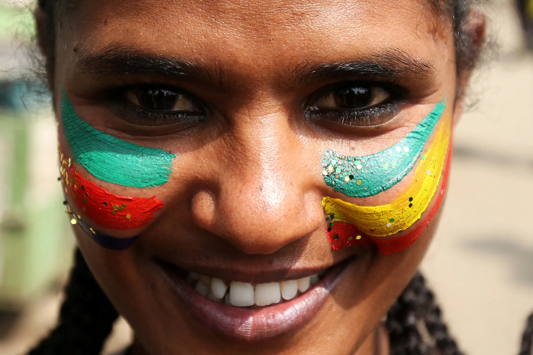 A woman with a face painting of the Ethiopia national flag attends a ceremony to welcome Eritrea's President Isaias Afwerki for a three-day visit, at the Bole international airport in Addis Ababa, Ethiopia July 14, 2018. (Photo by Tiksa Negeri/Reuters)