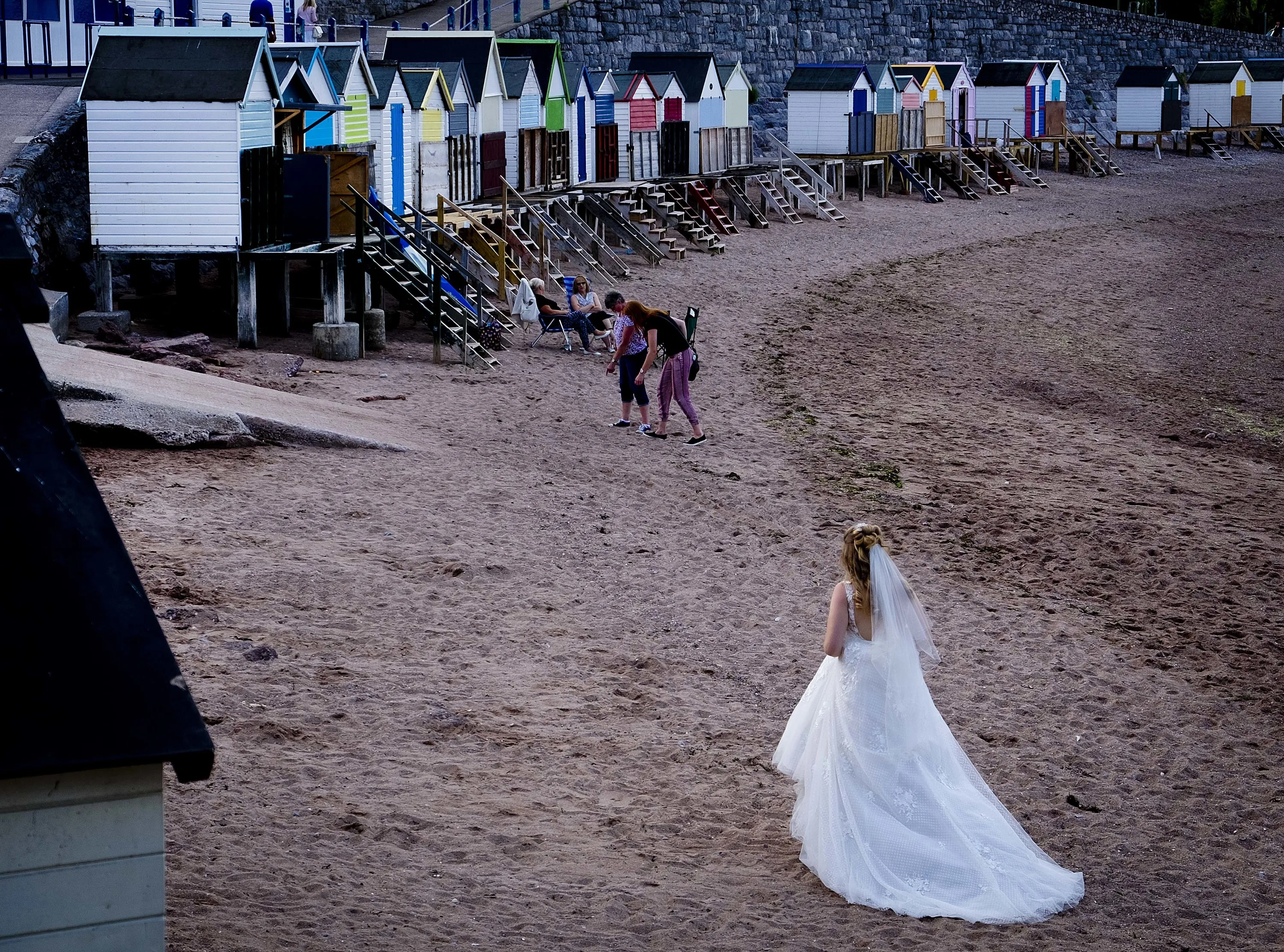 A bride walks along the beach in Torquay on the south coast of England during a photoshoot with the groom on Saturday, July 21, 2018. (Photo by Michael Probst/AP Photo)
