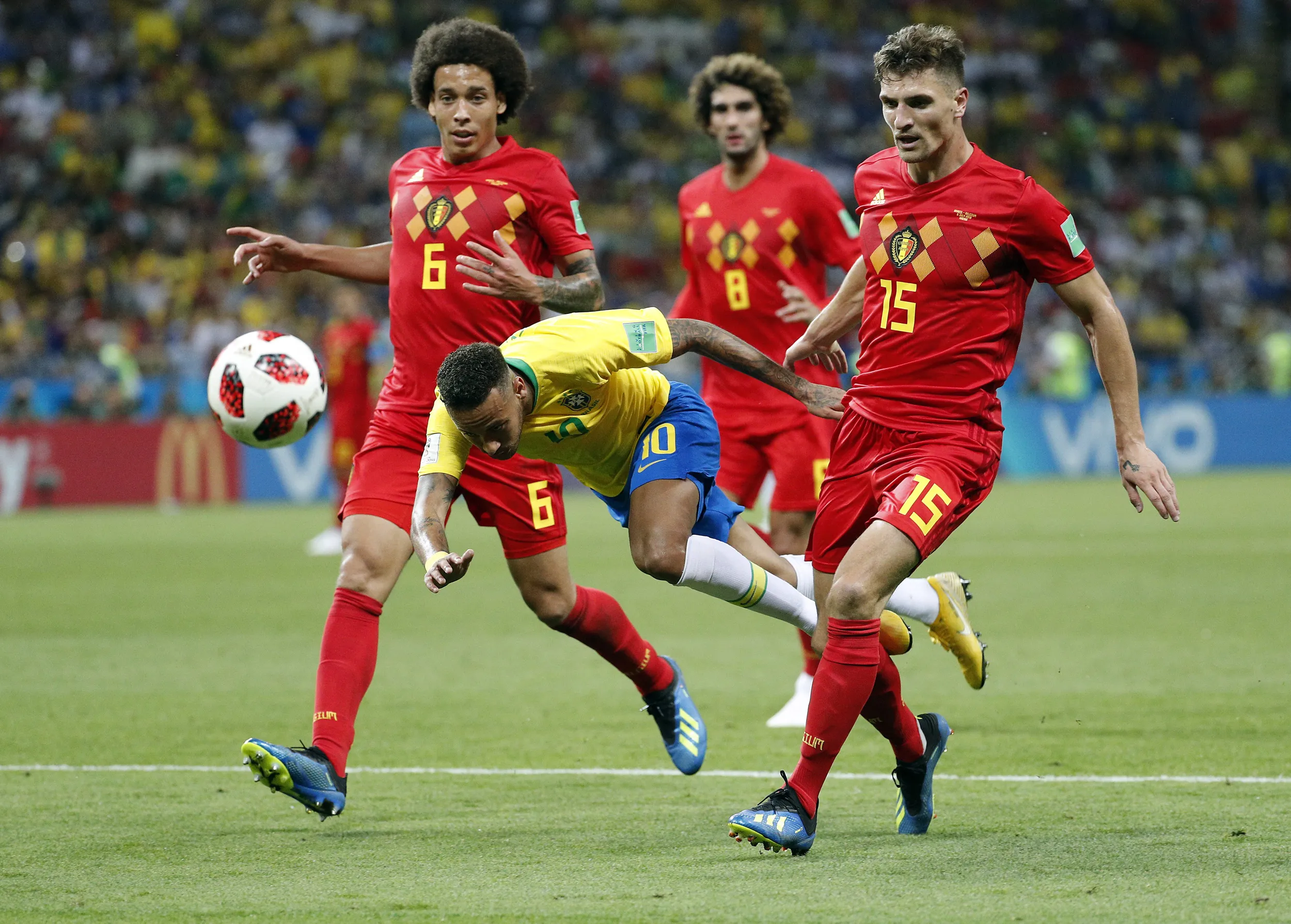 Neymar of Brazil (C) and Thomas Meunier of Belgium (R) in action during the FIFA World Cup 2018 quarter final soccer match between Brazil and Belgium in Kazan, Russia, 06 July 2018. (Photo by Sergey Dolzhenko/EPA/EFE)