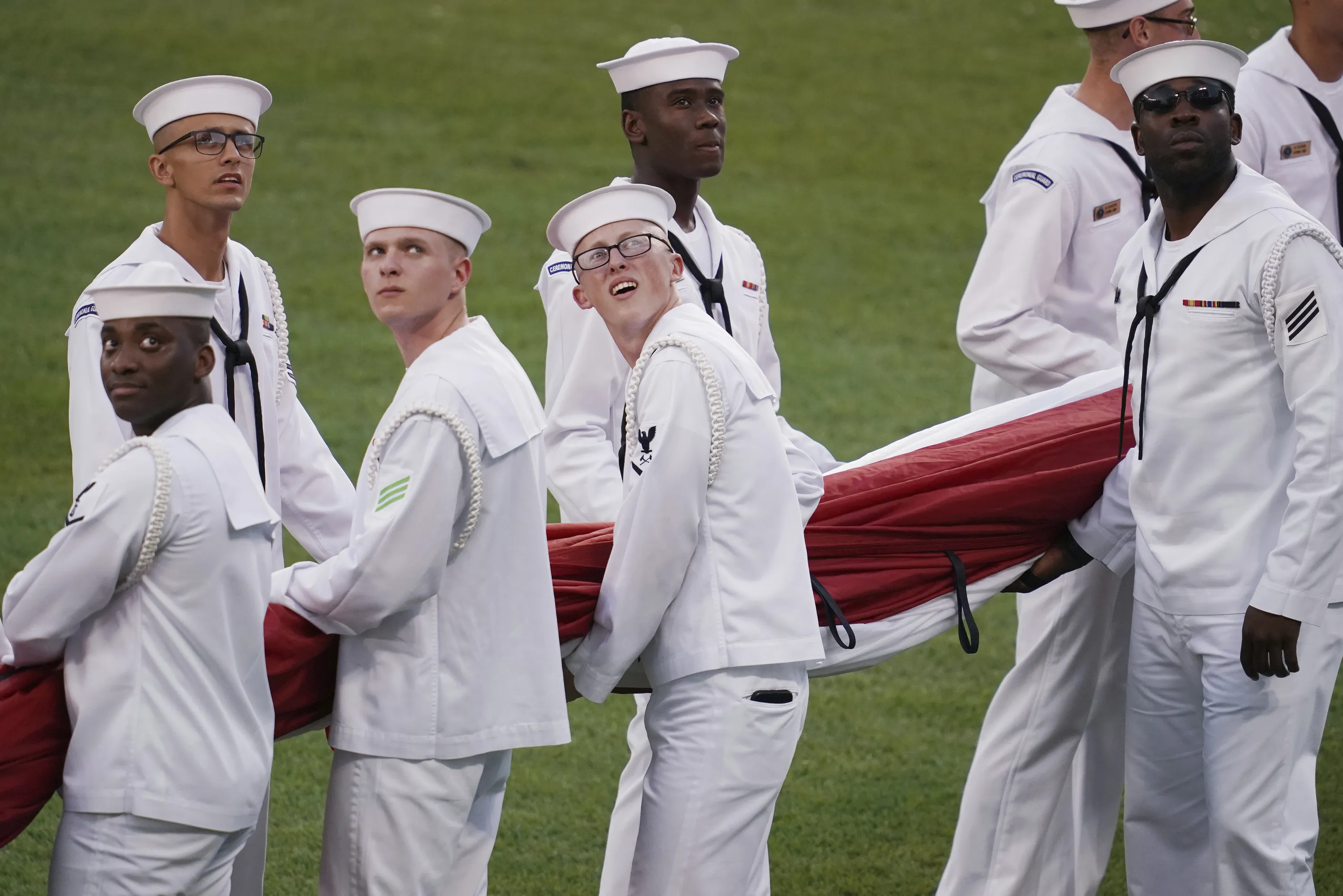 U.S. Navy sailors unfurl a flag before the MLB Home Run Derby, at Nationals Park, Monday, July 16, 2018 in Washington. The 89th MLB baseball All-Star Game will be played Tuesday. (Photo by Carolyn Kaster/AP Photo)