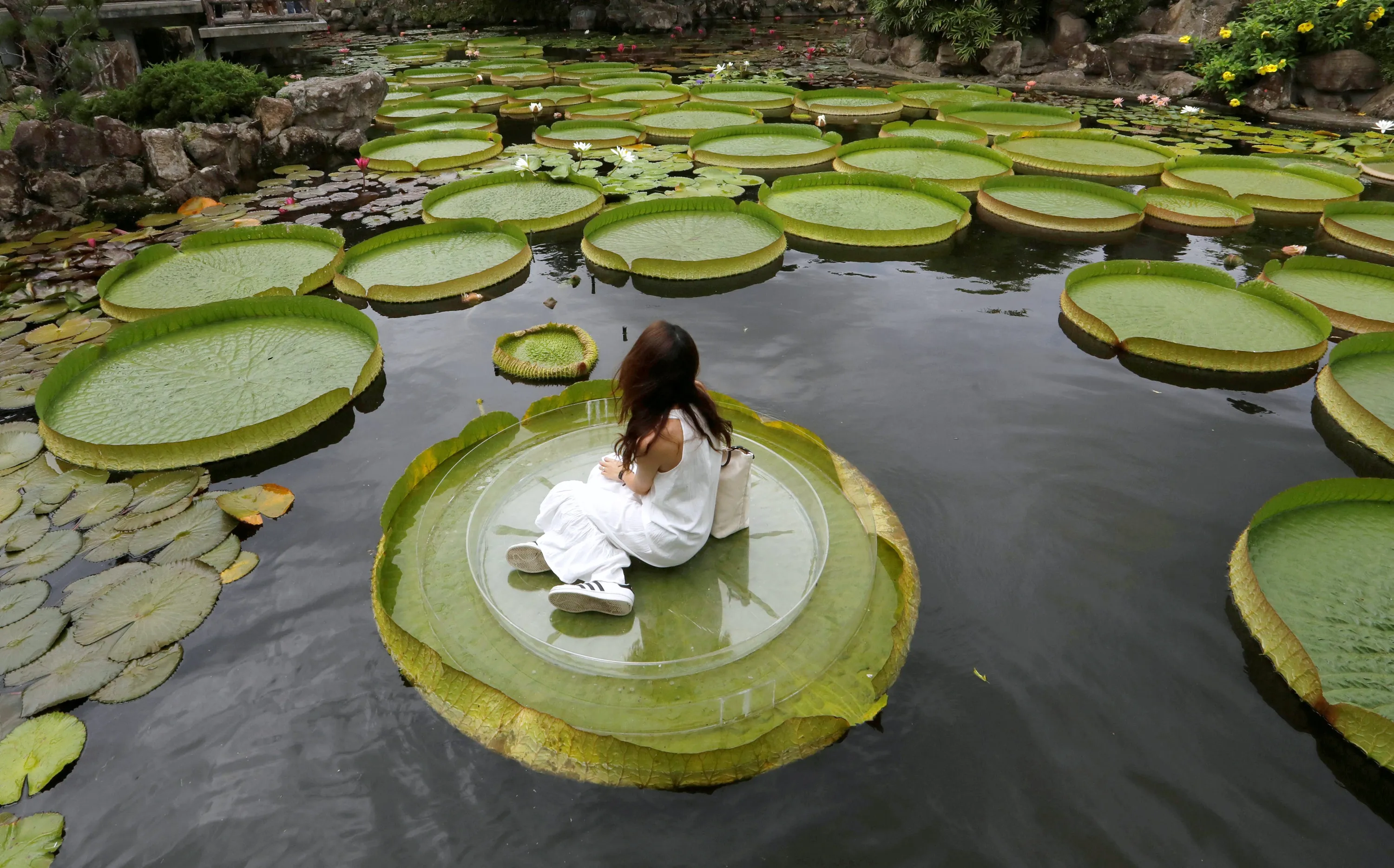 A girl poses for a photo on a giant waterlily leaf during an annual leaf-sitting event in Taipei, Taiwan on August 16, 2018. (Photo by Tyrone Siu/Reuters)