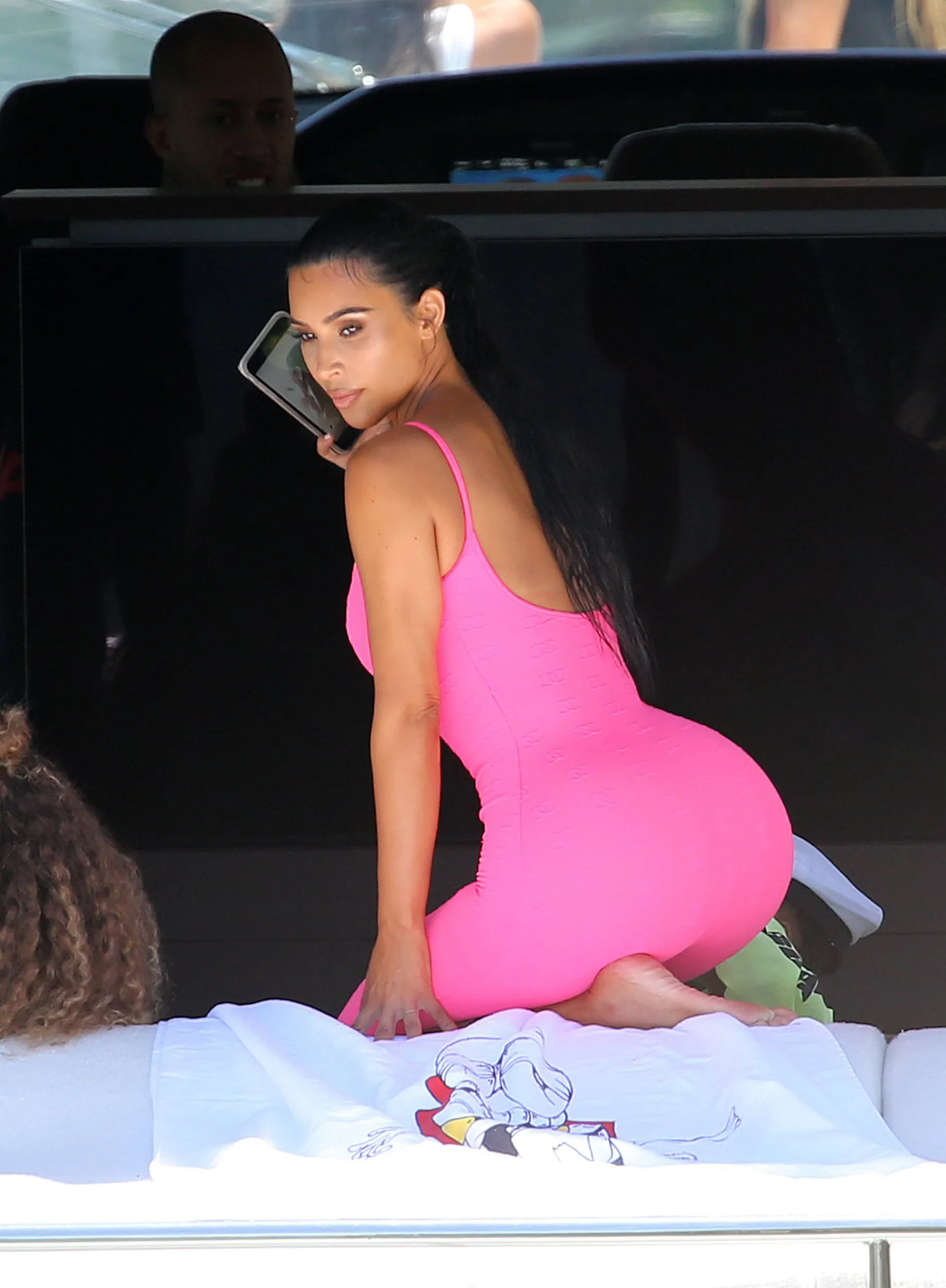Kim Kardashian wears a pink Chanel catsuit as she takes her children North and Saint on Dave Grumman's new yacht in Miami on August 16, 2018. (Photo by The Mega Agency)