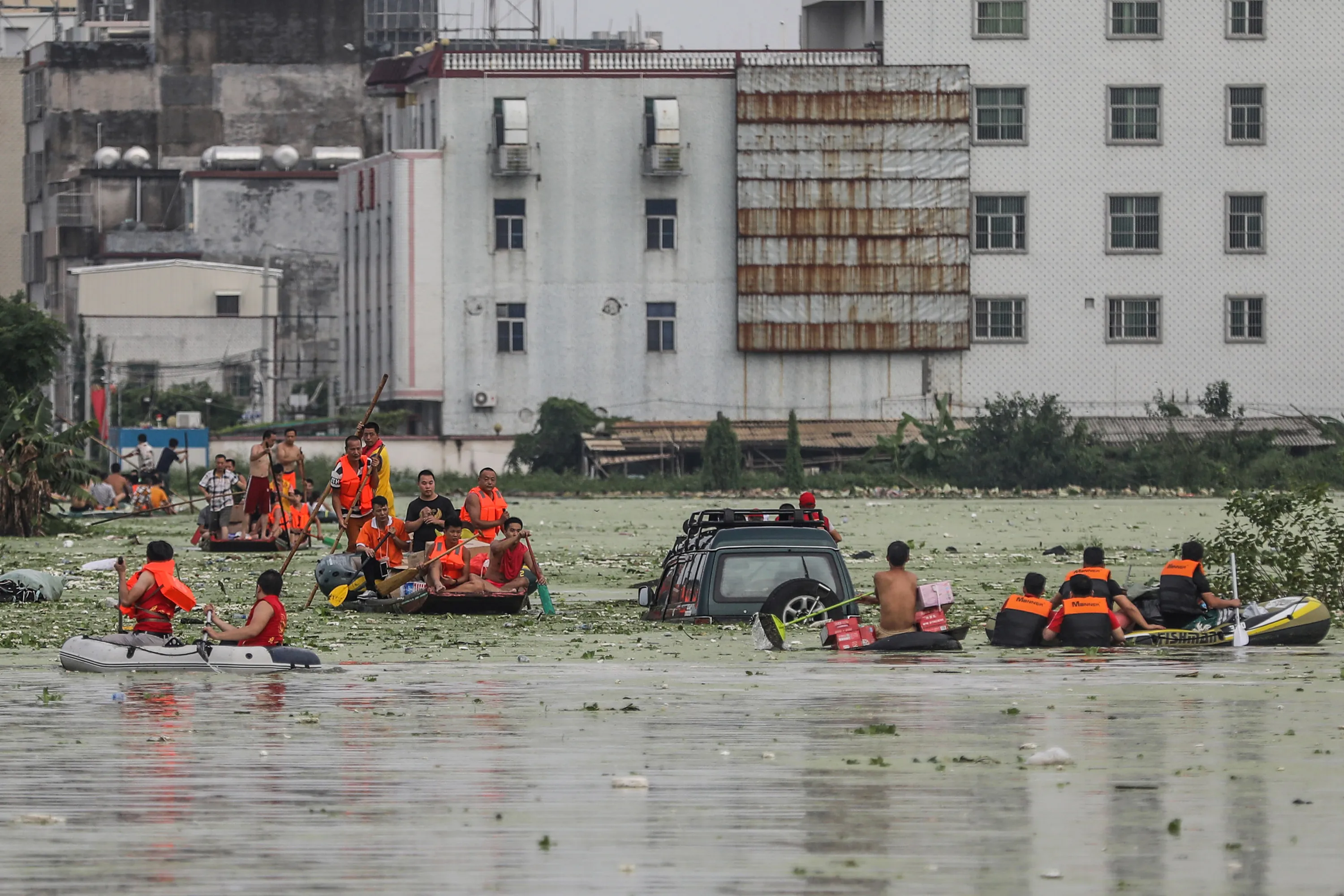 Rescue workers evacuate stranded residents by boat on a flooded street, following heavy rainfall at a village in Shantou, Guangdong province, China September 1, 2018. (Photo by Reuters/China Stringer Network)