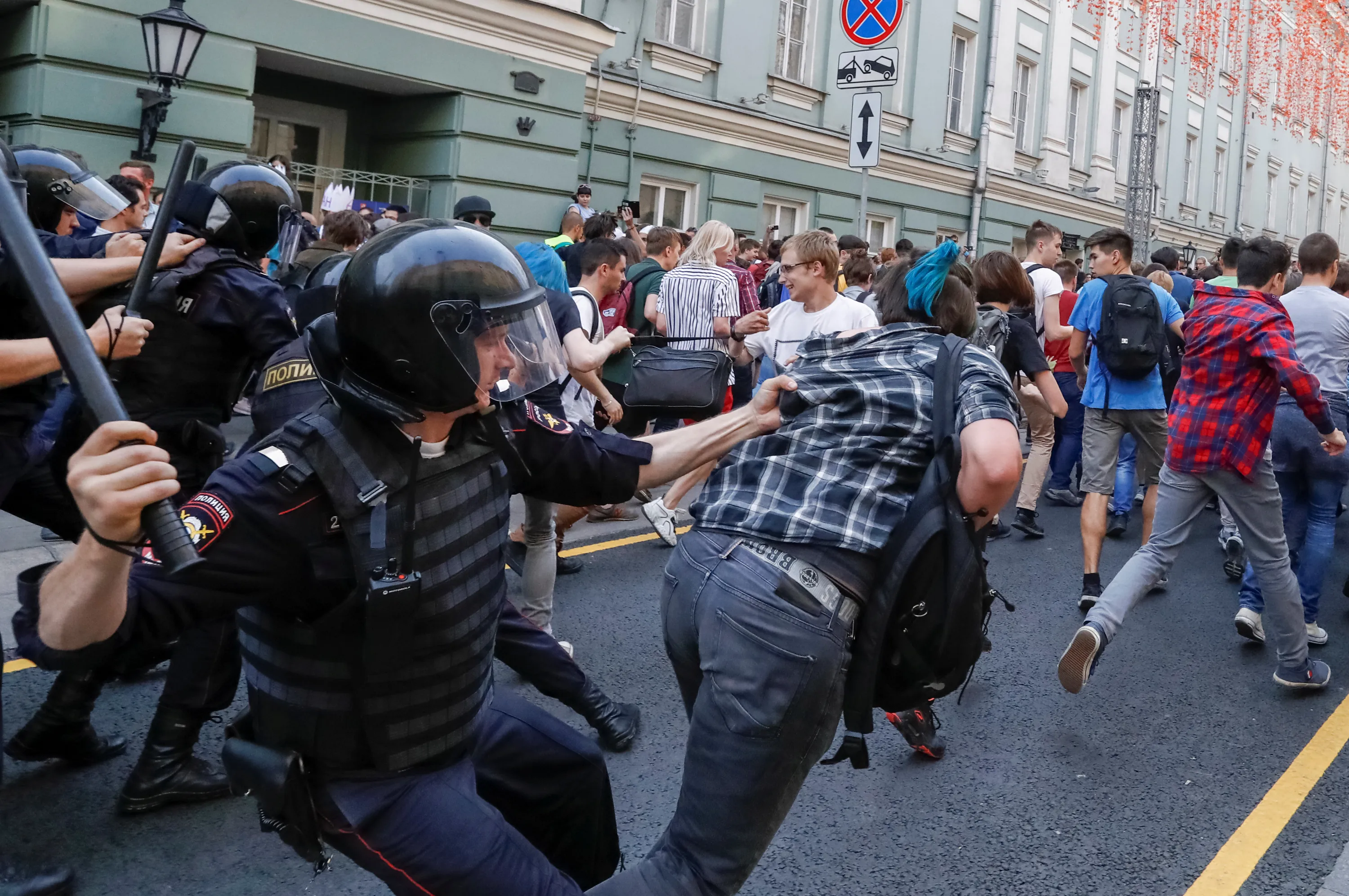 Police officers chase protesters during a rally against planned increases to the nationwide pension age in Moscow, Russia September 9, 2018. (Photo by Sergei Karpukhin/Reuters)