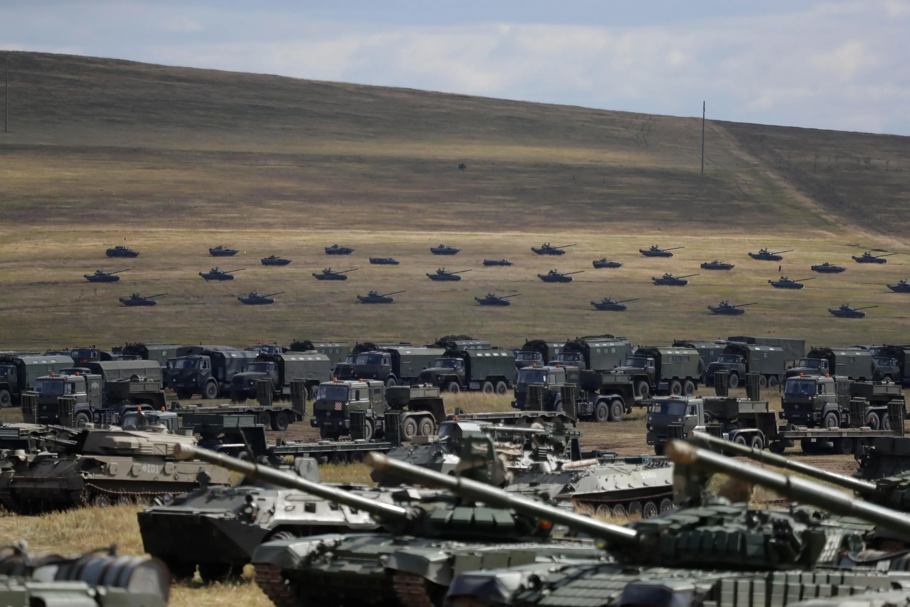 Tanks and other armored vehicles on the training ground “Tsugol”, about 250 kilometers (156 miles ) south-east of the city of Chita during the military exercises Vostok 2018 in Eastern Siberia, Russia, Thursday, Sept. 13, 2018. The weeklong Vostok (East) 2018 maneuvers launched Tuesday span vast expanses of Siberia and the Far East, the Arctic and the Pacific Oceans. They involve nearly 300,000 Russian troops along with 1,000 Russian aircraft and 36,000 tanks and other combat vehicles. (Photo by Sergei Grits/AP Photo)