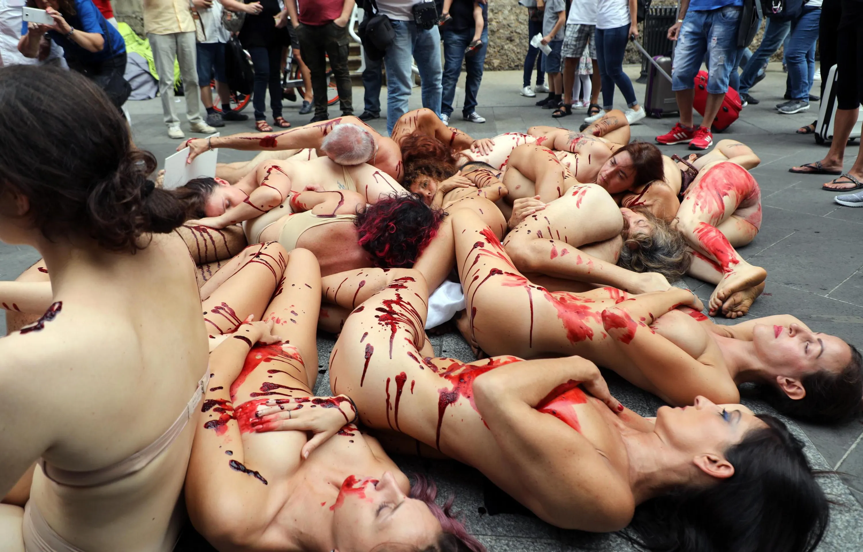 Animal rights activists protest against the use of animal leather in fashion businness, a few days before the fashion week opening in Milan, Italy, 16 September 2018. (Photo by Matteo Bazzi/EPA/EFE)