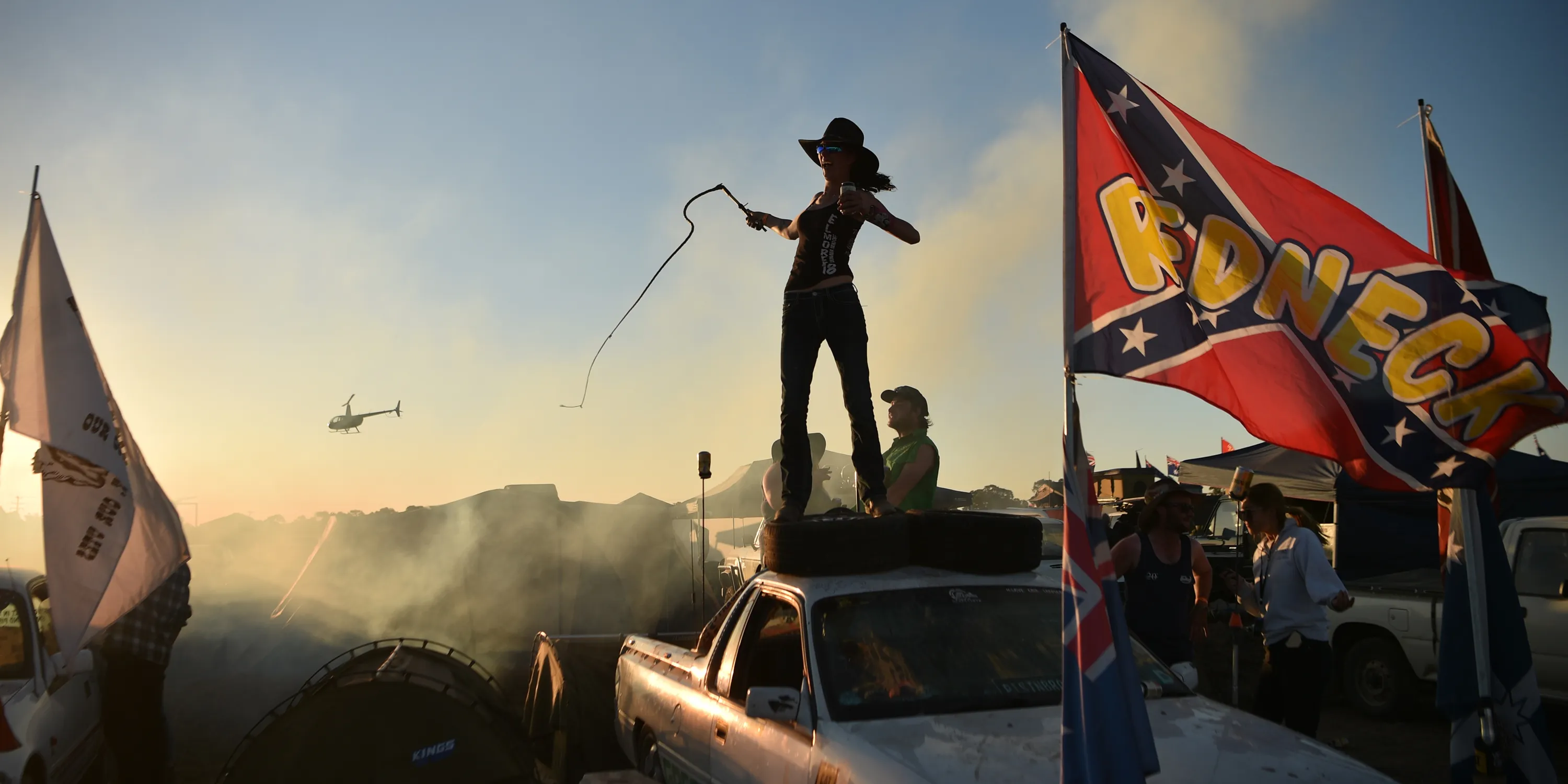 Photo taken on September 29, 2018 shows a reveller cracking a bull whip on top of her ute at the annual Deni Ute Muster in Deniliquin. Thousands of people flocked to the rural Australian town of Deniliquin in a rowdy celebration of their love of utility vehicles and the outback, with whip-cracking and bull-riding contests among the highlights. (Photo by Peter Parks/AFP Photo)