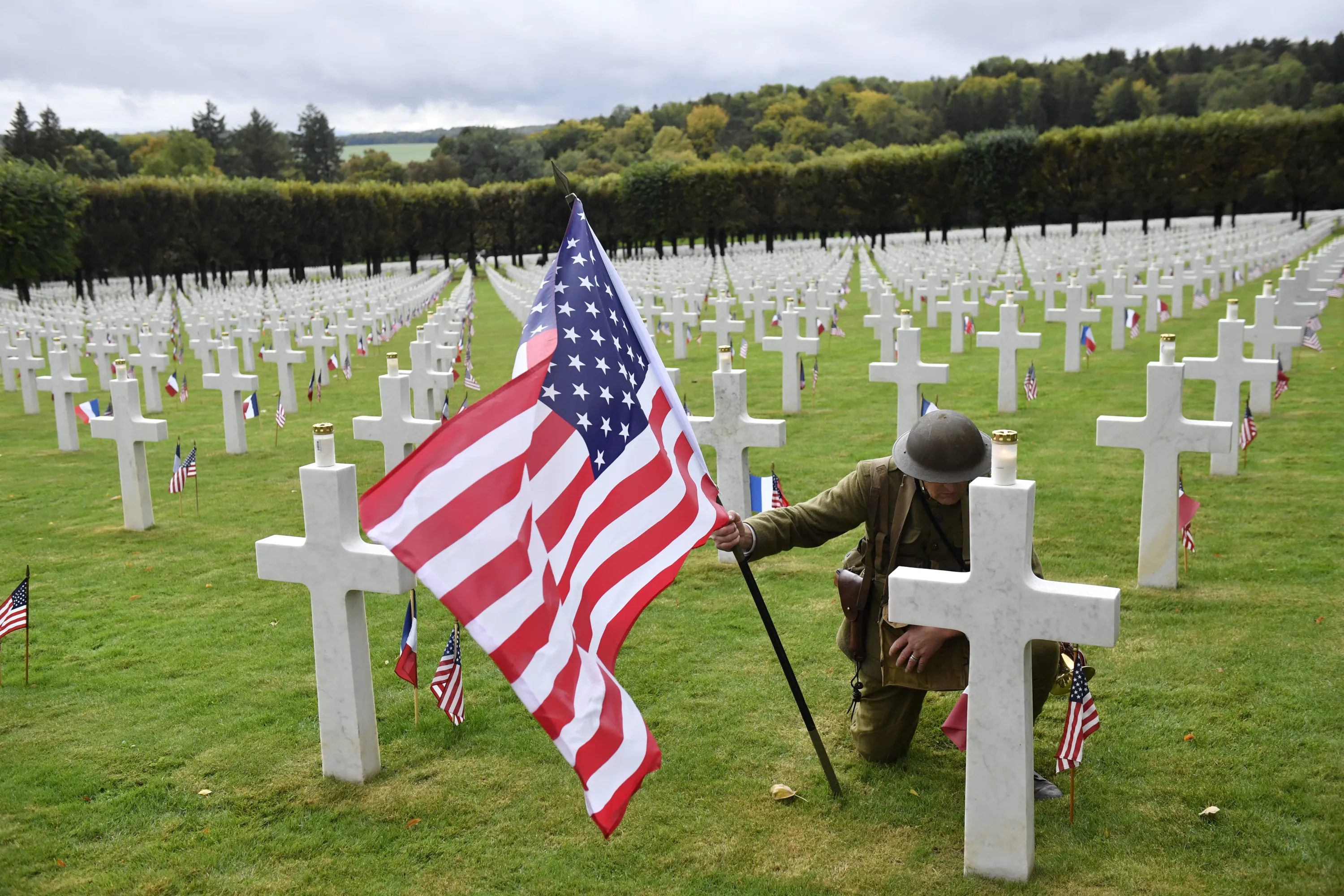 A man in WWI military uniform poses at the Meuse-Argonne American Cemetery, northeastern France, during a remembrance ceremony, on Sunday. September 23, 2018. A remembrance ceremony is taking place Sunday for the 1918 Meuse-Argonne offensive, America's deadliest battle ever that cost 26,000 lives but helped bring an end to World War 1. (Photo by Julien de Rosa/AP Images for WW1 Centennial)