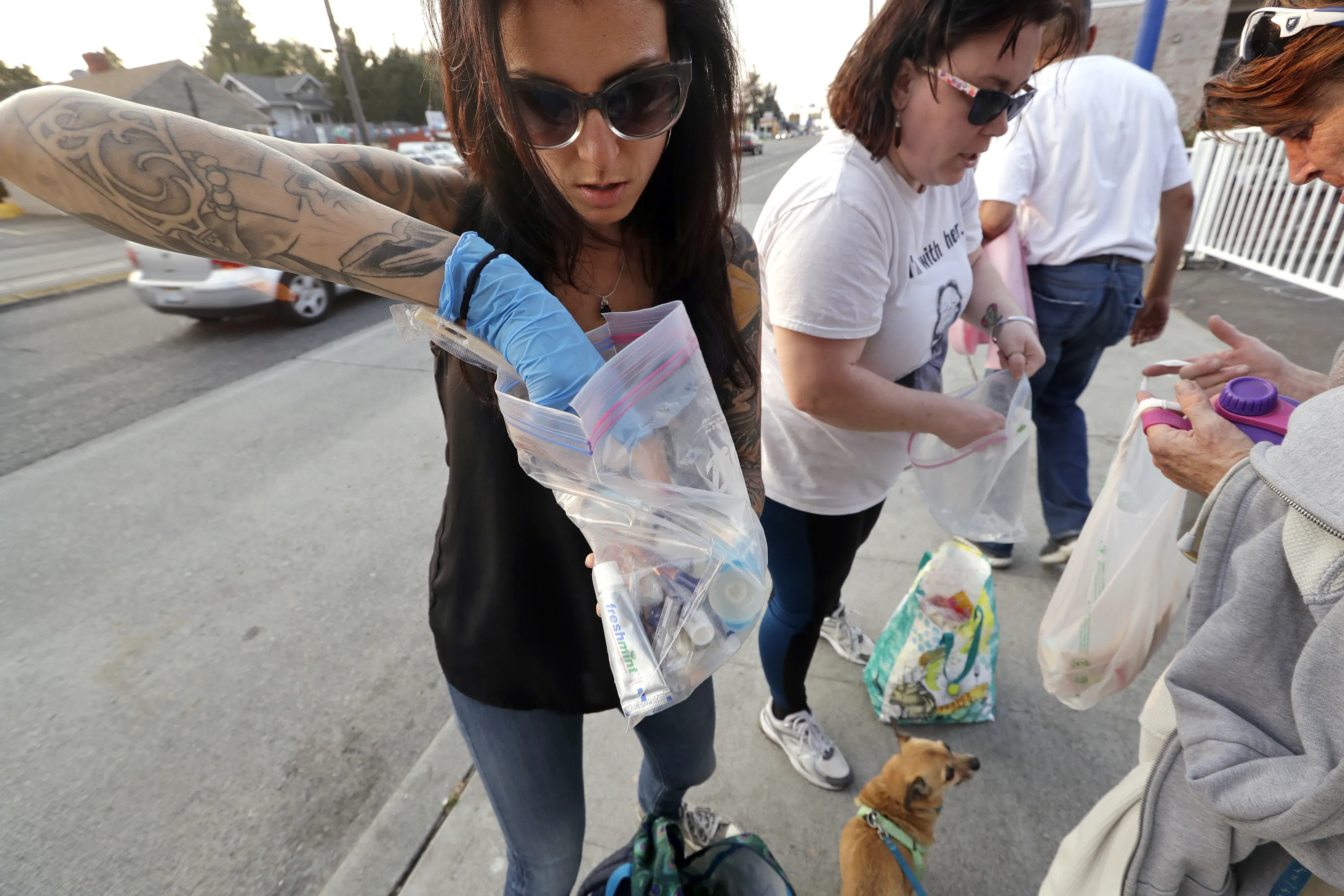 In this August 9, 2018, photo, Safe Night Access Project in Seattle volunteers Justice Rivera, left, and Laura LeMoon pass out supplies to people on the street while providing harm reduction services to sex workers along a north Seattle strip known for prostitution. Recent crackdowns targeting the sex-for-hire industry have reduced the number of commercial ads on the internet and helped fight online trafficking. But activists and police say the efforts may have had unintended consequences – landing women and girls back on the streets, where dangers also lurk. (Photo by Elaine Thompson/AP Photo)