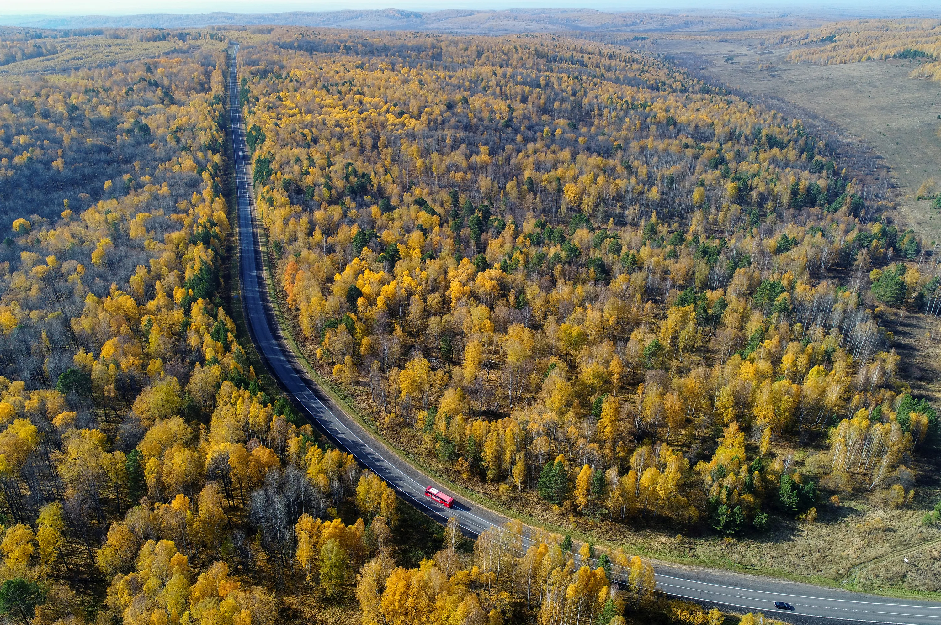 Vehicles drive along the “Yenisei” highway across taiga in autumn foliage in the Krasnoyarsk region, Siberia, Russia, September 29, 2018. (Photo by Ilya Naymushin/Reuters)