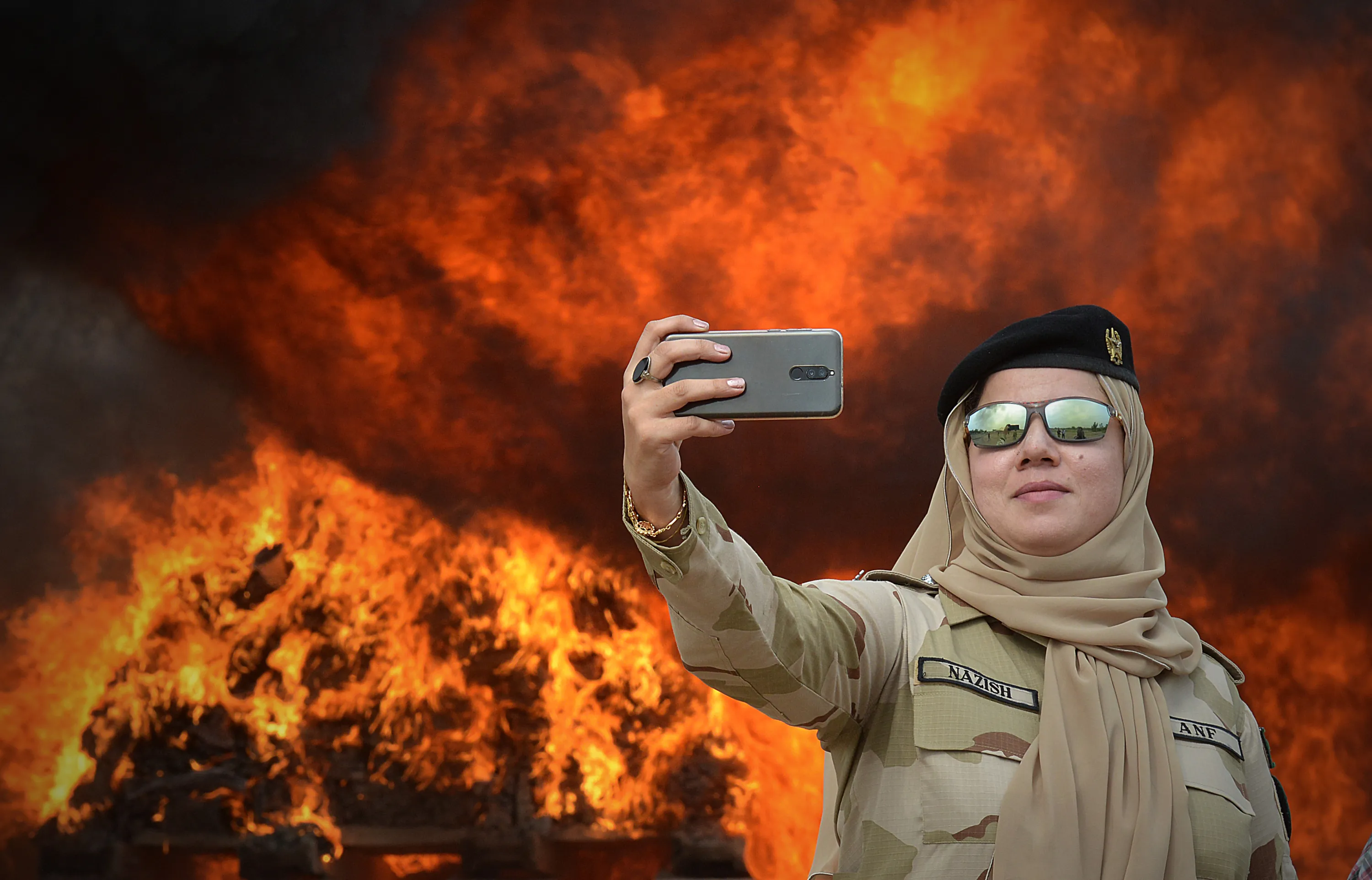 A member of the Pakistani Anti-Narcotic Force (ANF) takes a selfie beside a pile of burning drugs and liquor during a ceremony at the Kacha Ghari army firing range, on the outskirts of Peshawar on October 16, 2018, after the contraband was seized in raids across the province. (Photo by Abdul Majeed/AFP Photo)