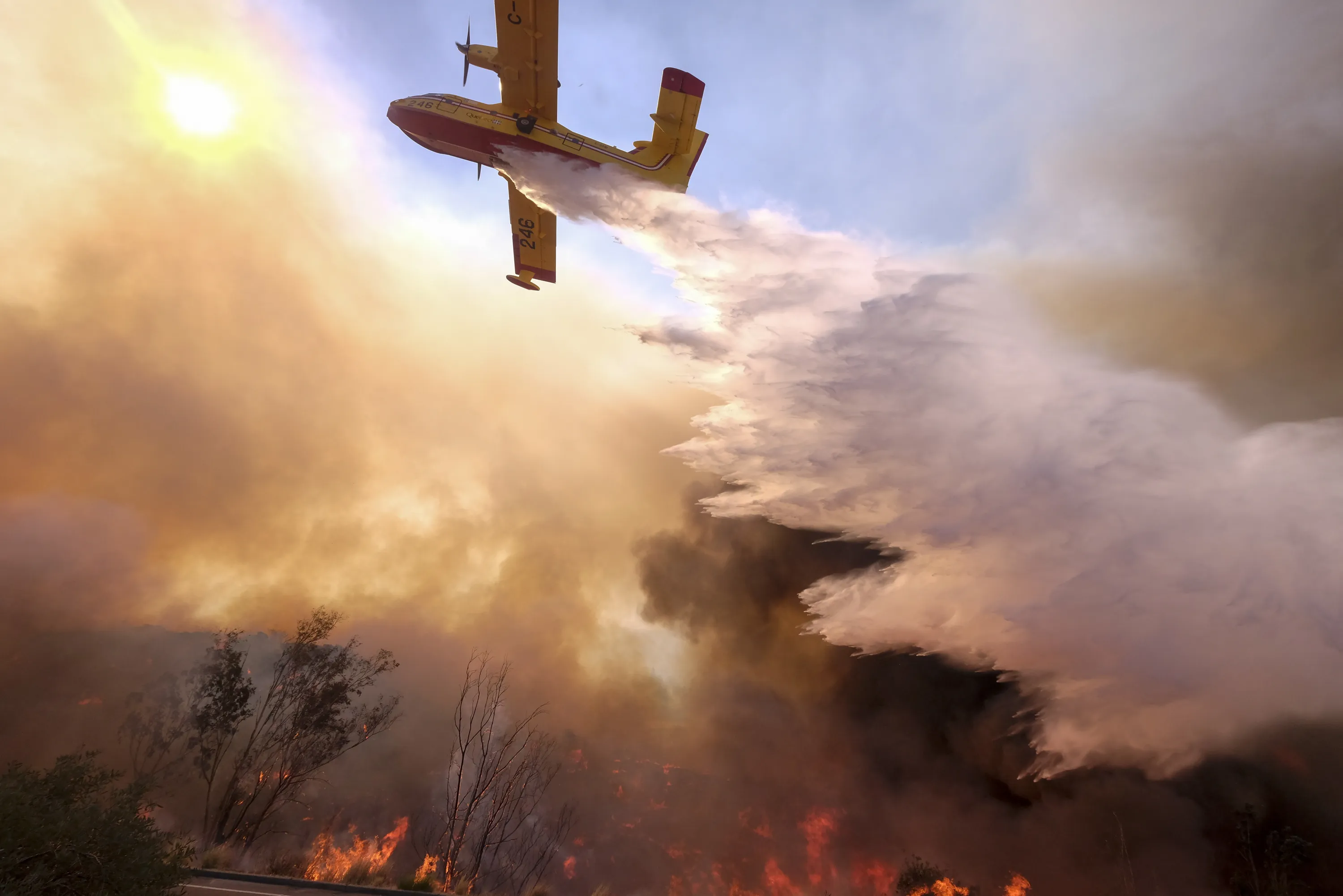 An air tanker drops water on a fire along the Ronald Reagan (118) Freeway in Simi Valley, Calif., Monday, November 12, 2018. (Photo by Ringo H.W. Chiu/AP Photo)