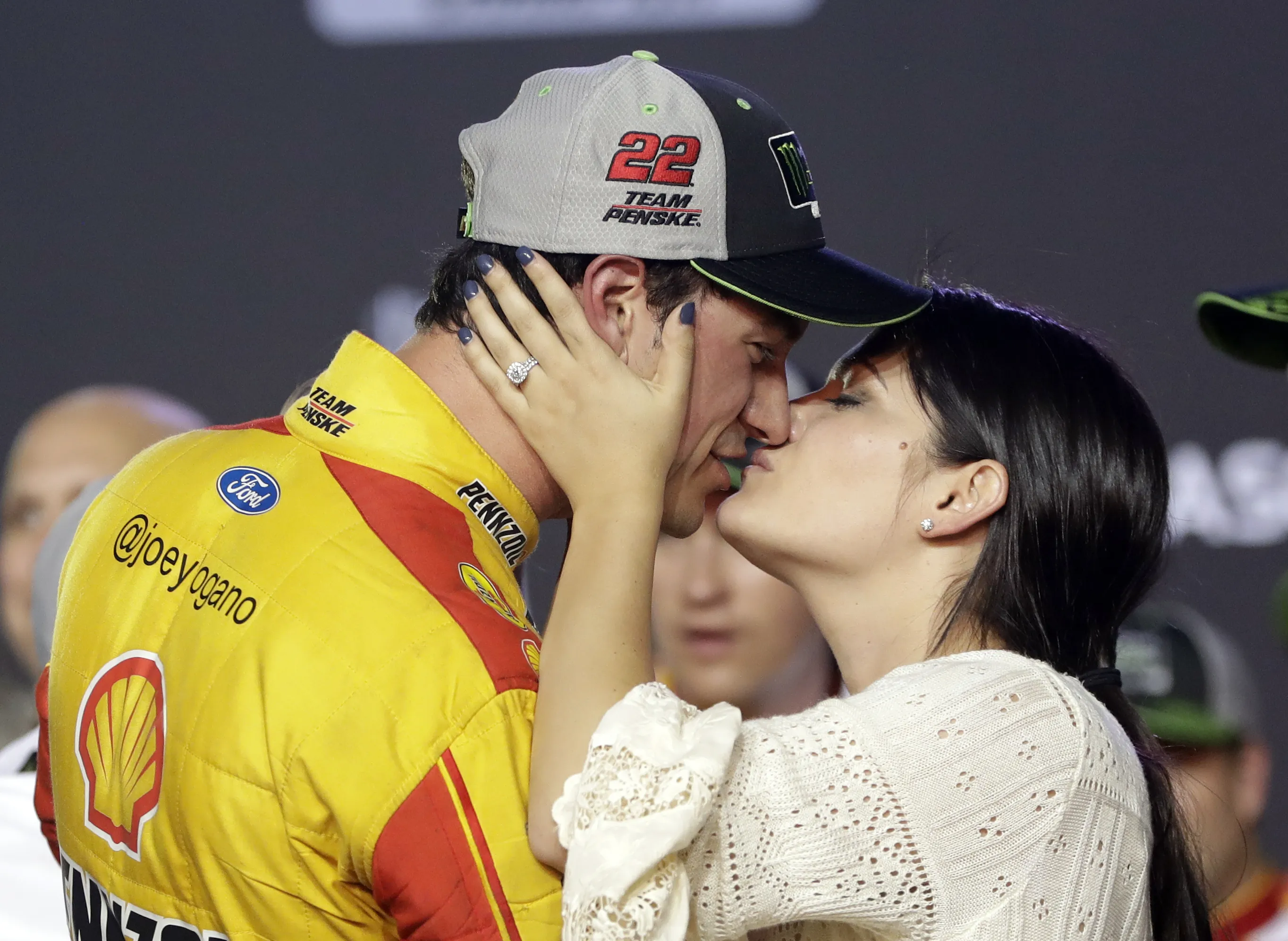 Joey Logano kisses his wife, Brittany Baca, after winning the NASCAR Cup Series championship auto race at Homestead-Miami Speedway, Sunday, November 18, 2018, in Homestead, Fla. (Photo by Lynne Sladky/AP Photo)