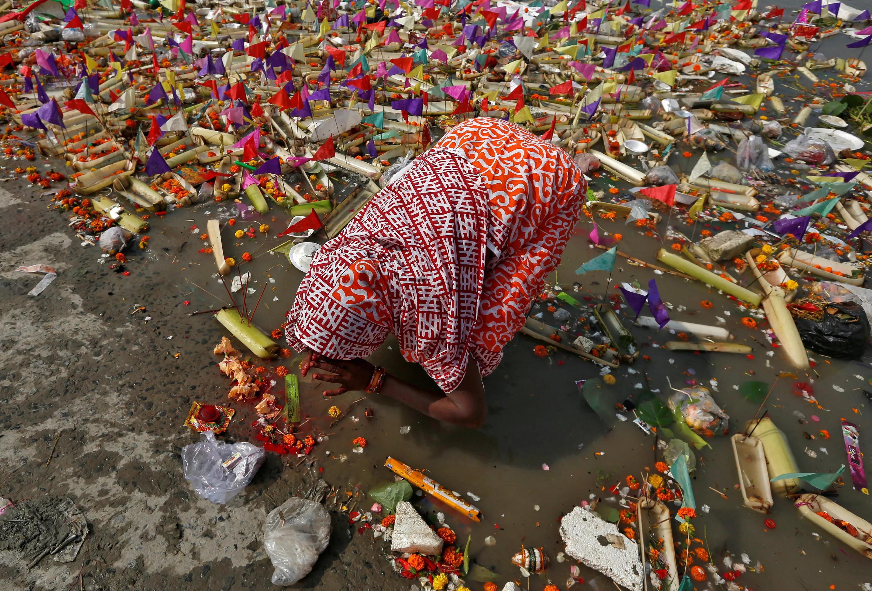 A woman worships after floating a small decorated boat made with banana stem in the waters of the Ganga river on the occasion of the annual Hindu festival of “Karthik Purnima” in Kolkata, India, November 23, 2018. (Photo by Rupak De Chowdhuri/Reuters)