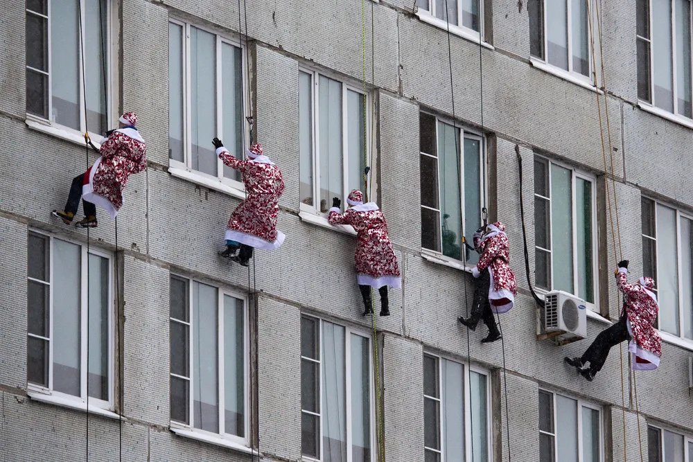 Russian emergency rescue workers dressed as Ded Moroz (Santa Claus, or Father Frost ) scale the wall of a children hospital in Moscow, Russia, Thursday, December 27, 2018. The action marked the approach of the New Year. (Photo by Alexander Zemlianichenko/AP Photo)