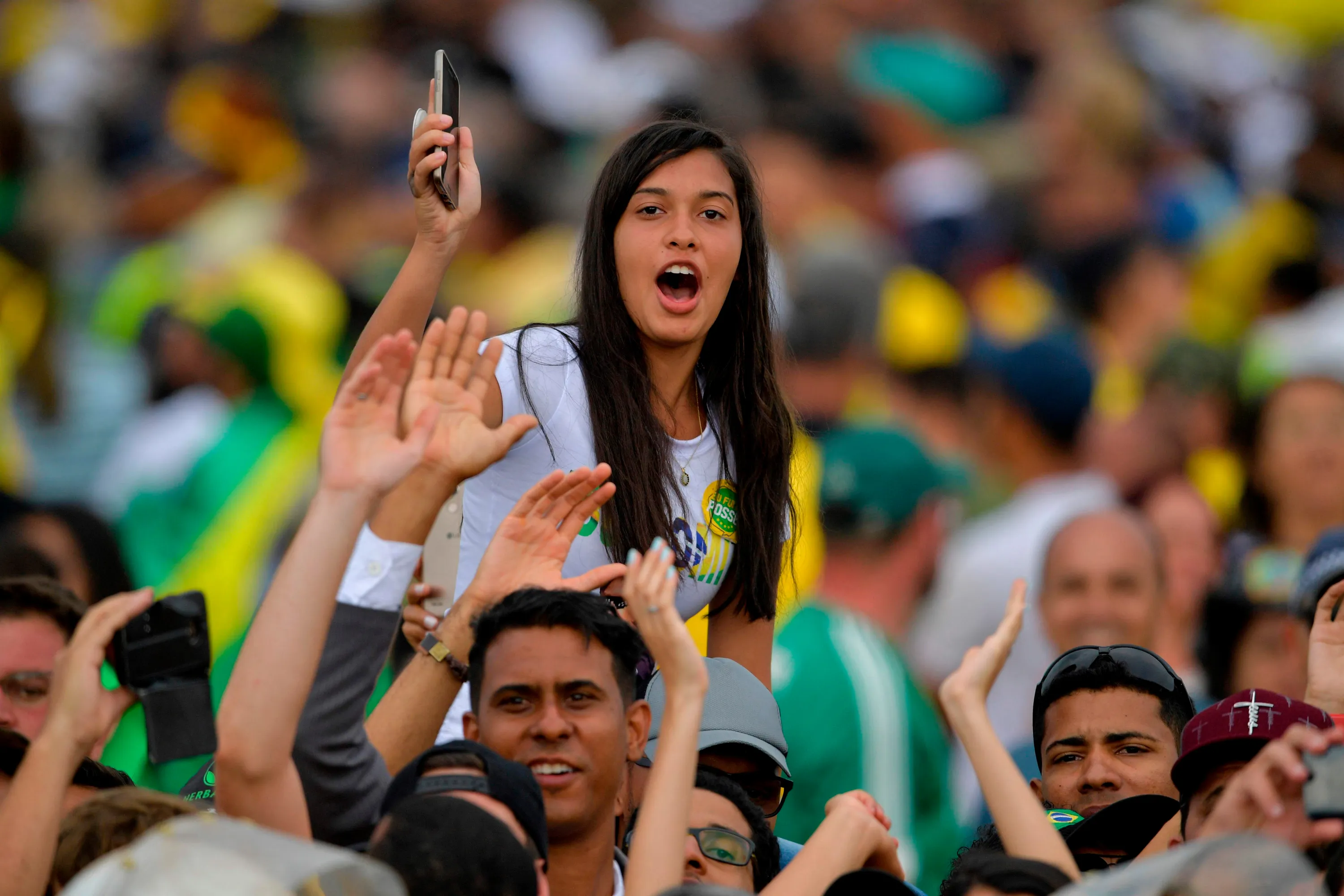Supporters of Brazil's President-elect Jair Bolsonaro cheer as the presidential convoy heads to the National Congress for his swearing-in ceremony, in Brasilia on January 1, 2019. Bolsonaro takes office with promises to radically change the path taken by Latin America's biggest country by trashing decades of centre-left policies. (Photo by Carl de Souza/AFP Photo)
