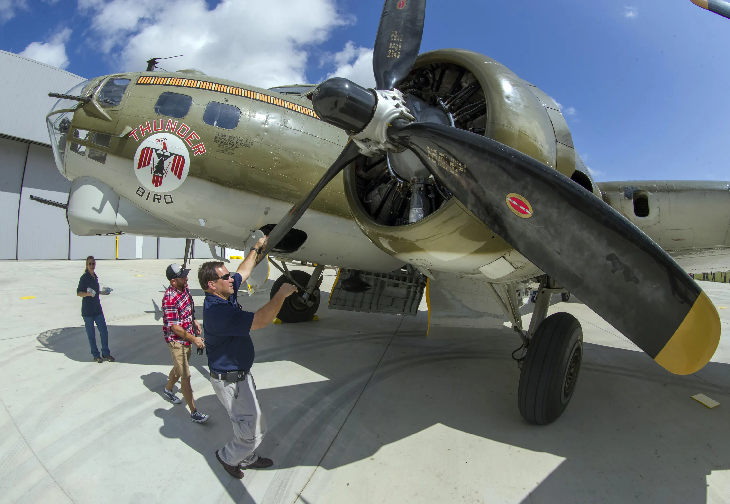 In this August 15, 2017 file photo, Lone Star Flight Museum President Larry Gregory aligns the propellers of the museum's B-17 after landing at the museum's new home at Ellington Airport in Houston. The Galveston building that housed the vintage military aircraft flight museum and was swamped in 2008 during Hurricane Ike has been sold. The Galveston County Daily News reports brothers Billy, John and Todd Sullivan purchased the 100,000-square-foot building formerly home to the Lone Star Flight Museum. (Photo by Stuart Villanueva/The Galveston County Daily News via AP Photo)