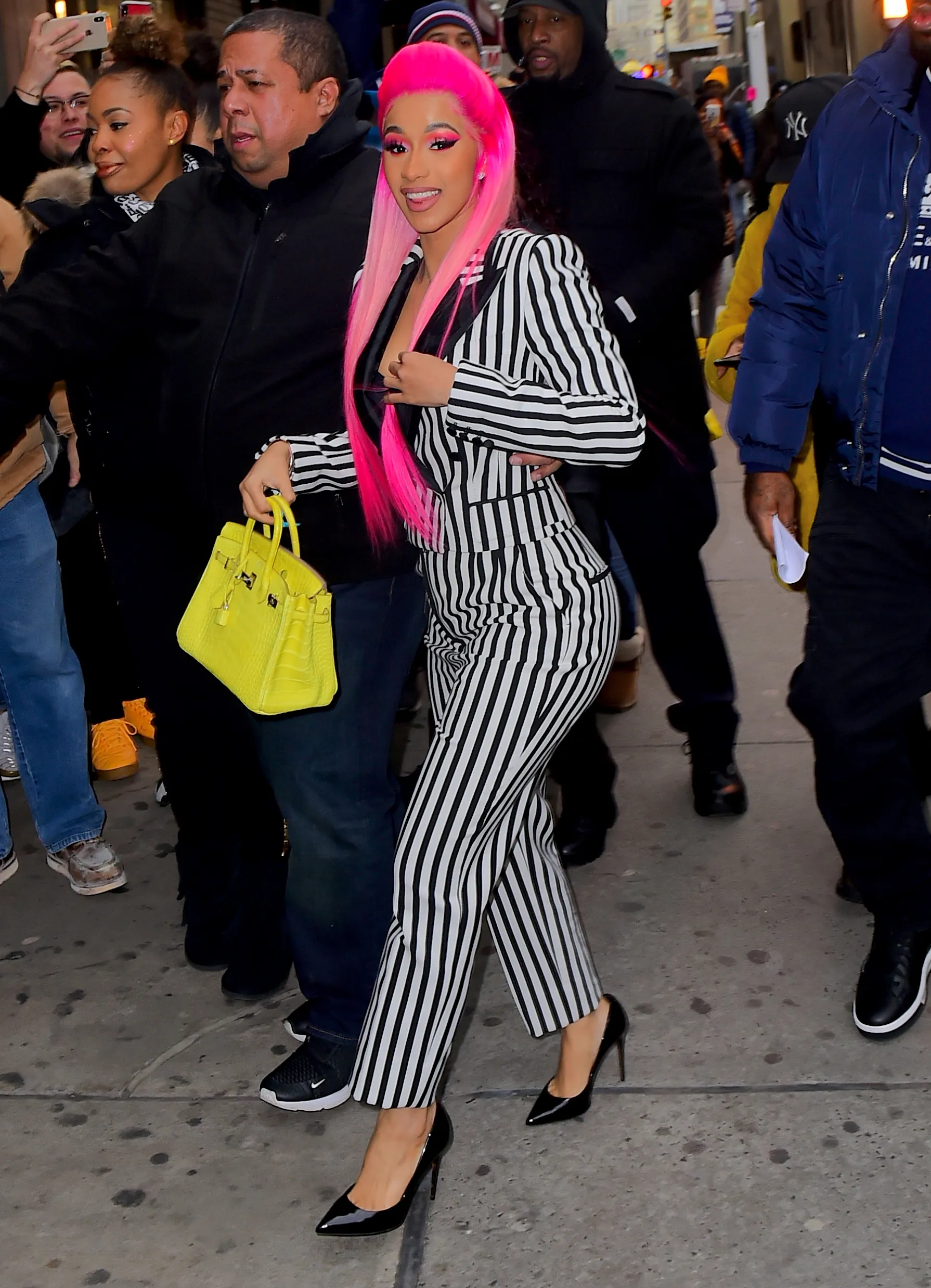 Cardi B was spotted out set of her new Netflix series, Rhythm and Flow in NYC on Wednesday, January 9, 2019. She was joined by Bronx Rappers, Fat Joe, and Jadakiss, who were also judges on the show with her, as they hunt for the next big Hip Hop talent. Cardi wore Highlighter pink hair, and a Beetlejuice inspired Black and White pinstripe Pantsuit as she left her Trailer. (Photo by 247PAPS.TV/Splash News and Pictures)