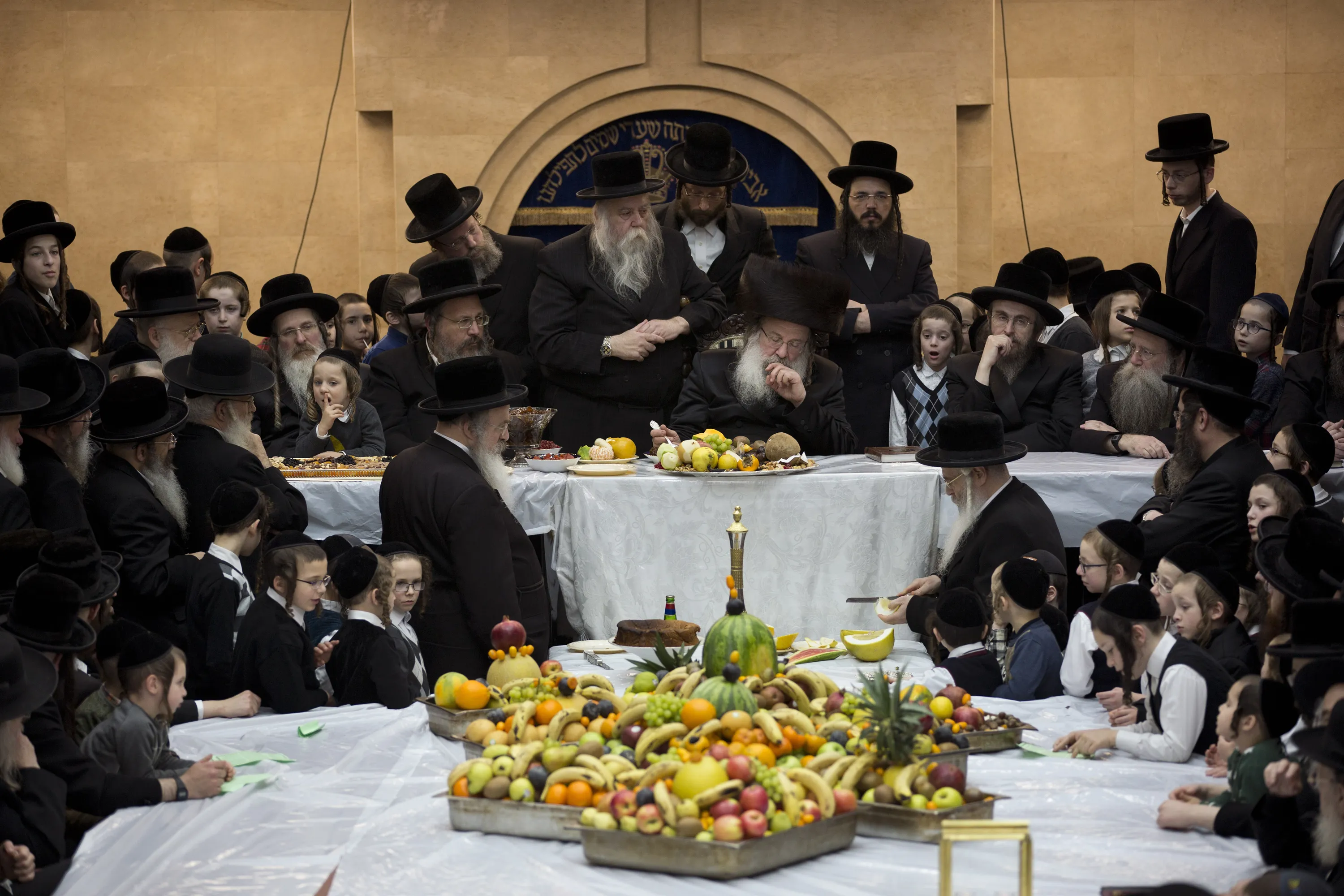 Ultra-Orthodox Jews of the Nadvorna Hasidic dynasty celebrate the Jewish feast of “Tu Bishvat” or “New Year of the Trees” as they sit with their rabbis around a long table filled with all kinds of fruits, in the ultra-Orthodox town of Bnei Brak, Israel, Monday, January 21, 2019. (Photo by Oded Balilty/AP Photo)