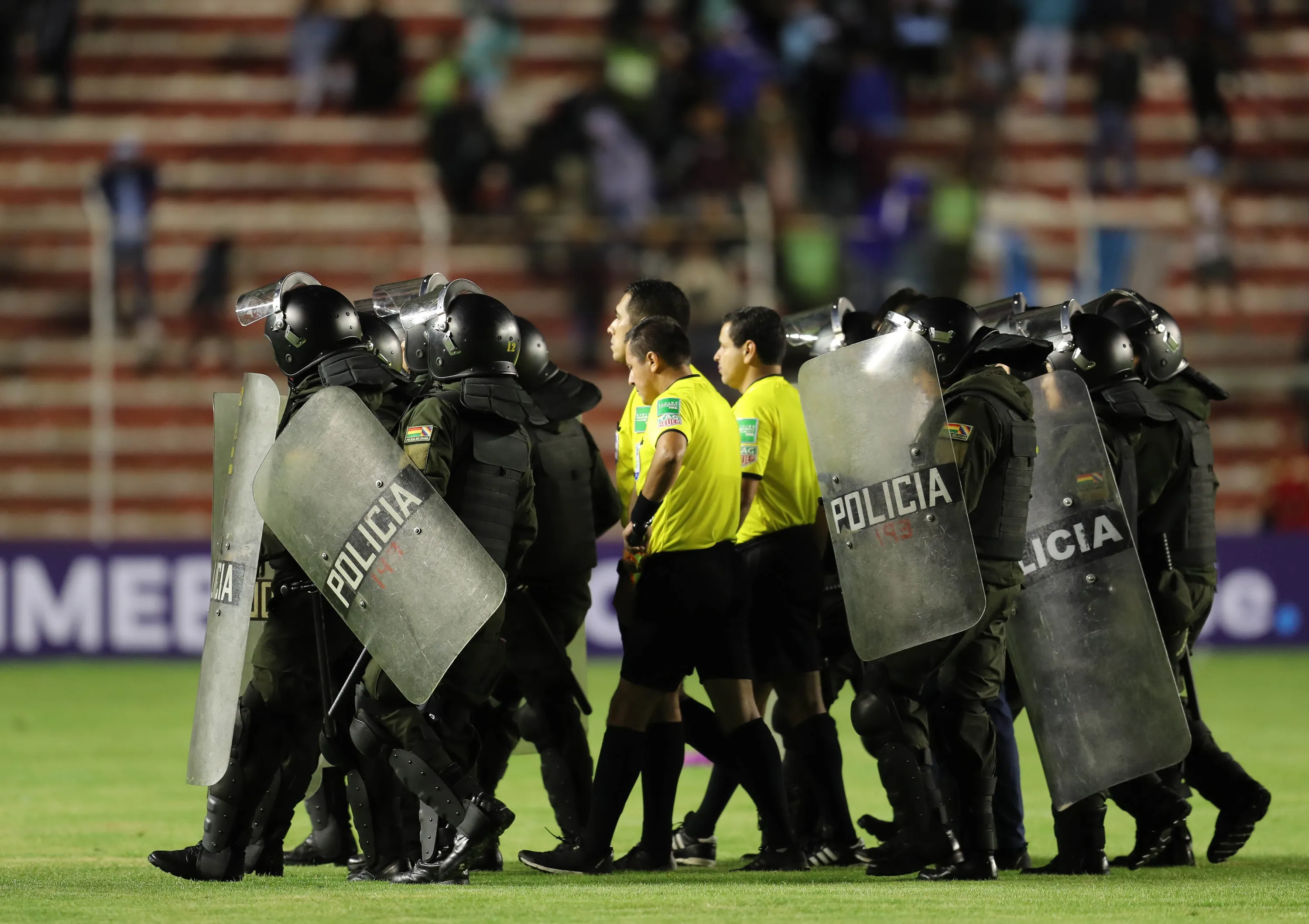 Members of the police protect Peruvian referee Diego Haro and his line judges (in yellow) during the Copa Libertadores match between Bolivar and Defensor Sporting at the Hernando Siles stadium in La Paz, Bolivia, 23 January 2019. (Photo by Martin Alipaz/EPA/EFE)