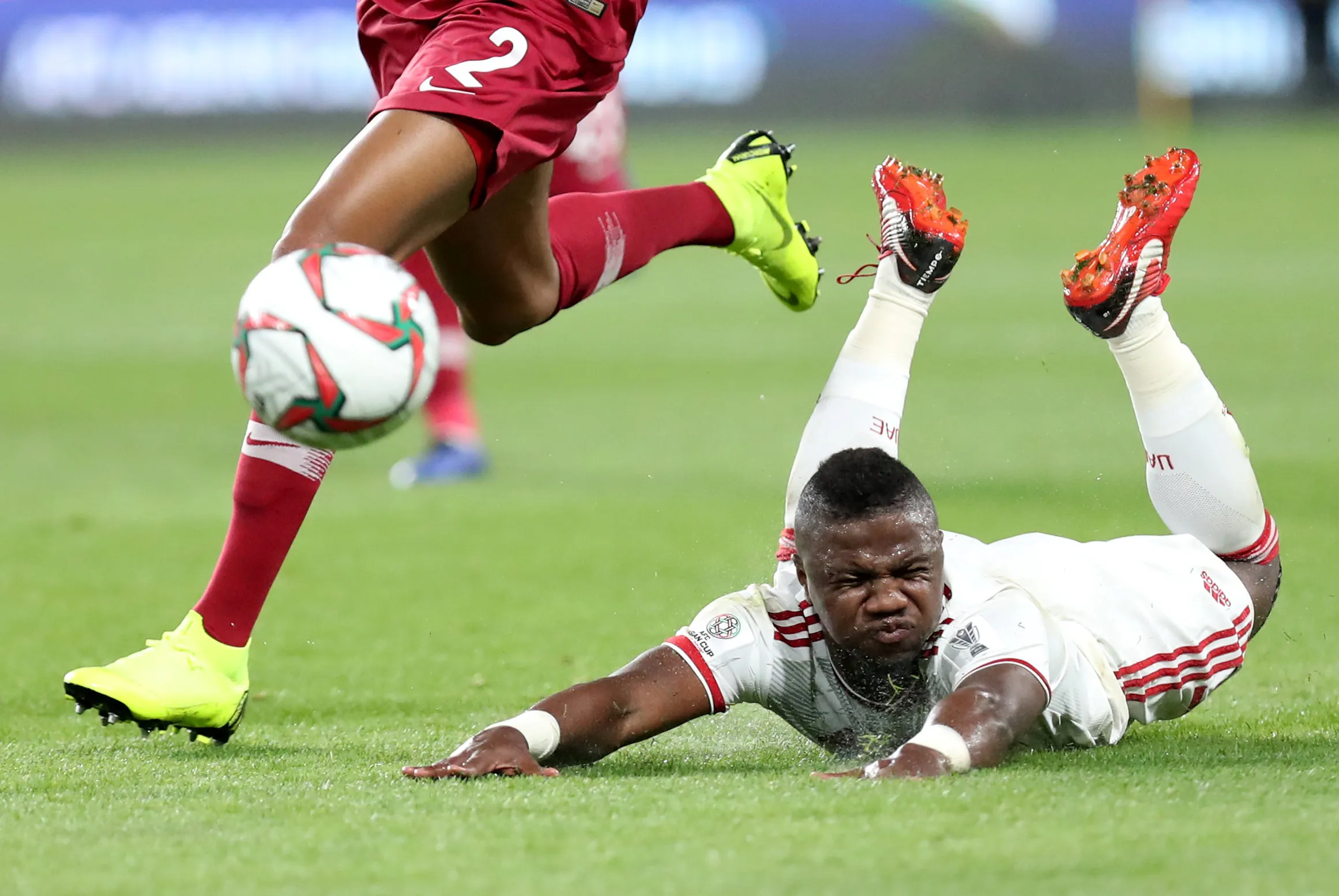 Ismail Al Hamadi of United Arab Emirates in action with Qatar's Ro-Ro during the first half of their 4-0 win over the United Arab Emirates in an Asian Cup semifinal in Abu Dhabi on Jan. 29, 2019. (Photo by Suhaib Salem/Reuters)