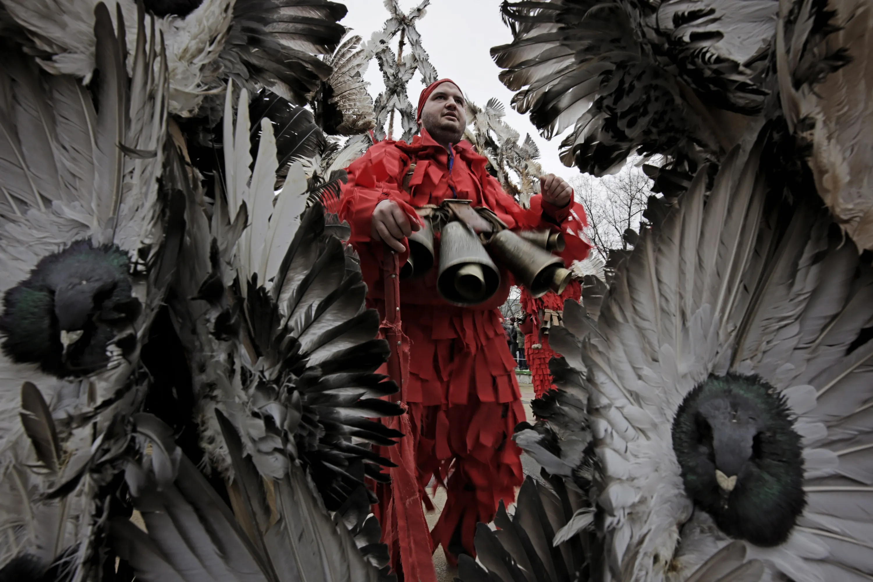 Masked Bulgarian dancers from the village of Kosharevo take part in the 28th International Festival of Masquerade Games “Surva” in the town of Pernik, Bulgaria Saturday, January 26, 2019. The carnival in the city of Pernik, attracted a record number of 7,500 participants from all over the country, as well as foreign dancers from across Europe. It marks the culmination of traditional winter festivities that are believed to date back to pagan times. (Photo by Valentina Petrova/AP Photo)