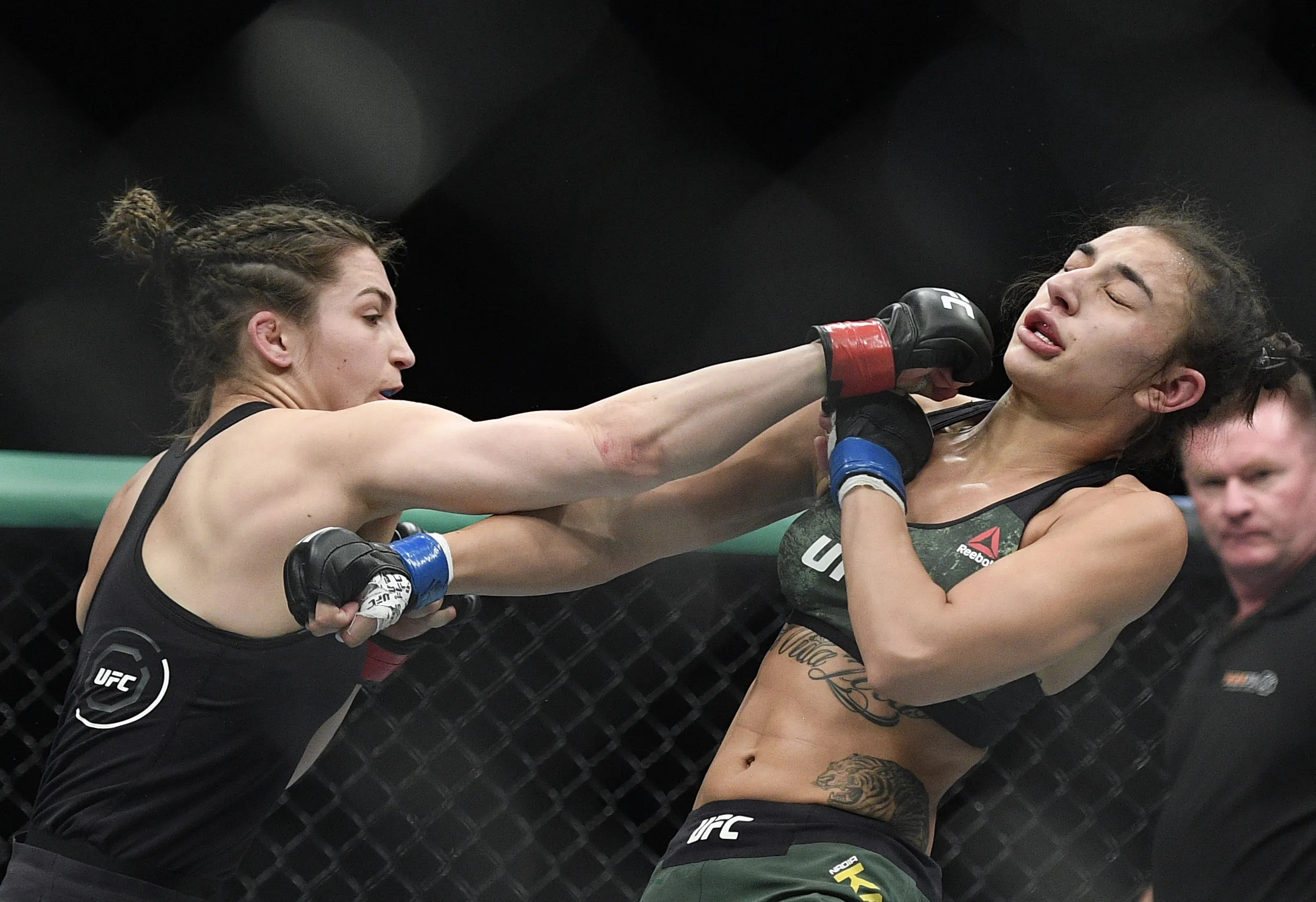 Montana De La Rosa, left, of the U.S., and Australia's Nadia Kassem fight during their Women's Flyweight bout at the UFC 234 event in Melbourne, Australia, Sunday, February 10, 2019. (Photo by Andy Brownbill/AP Photo)