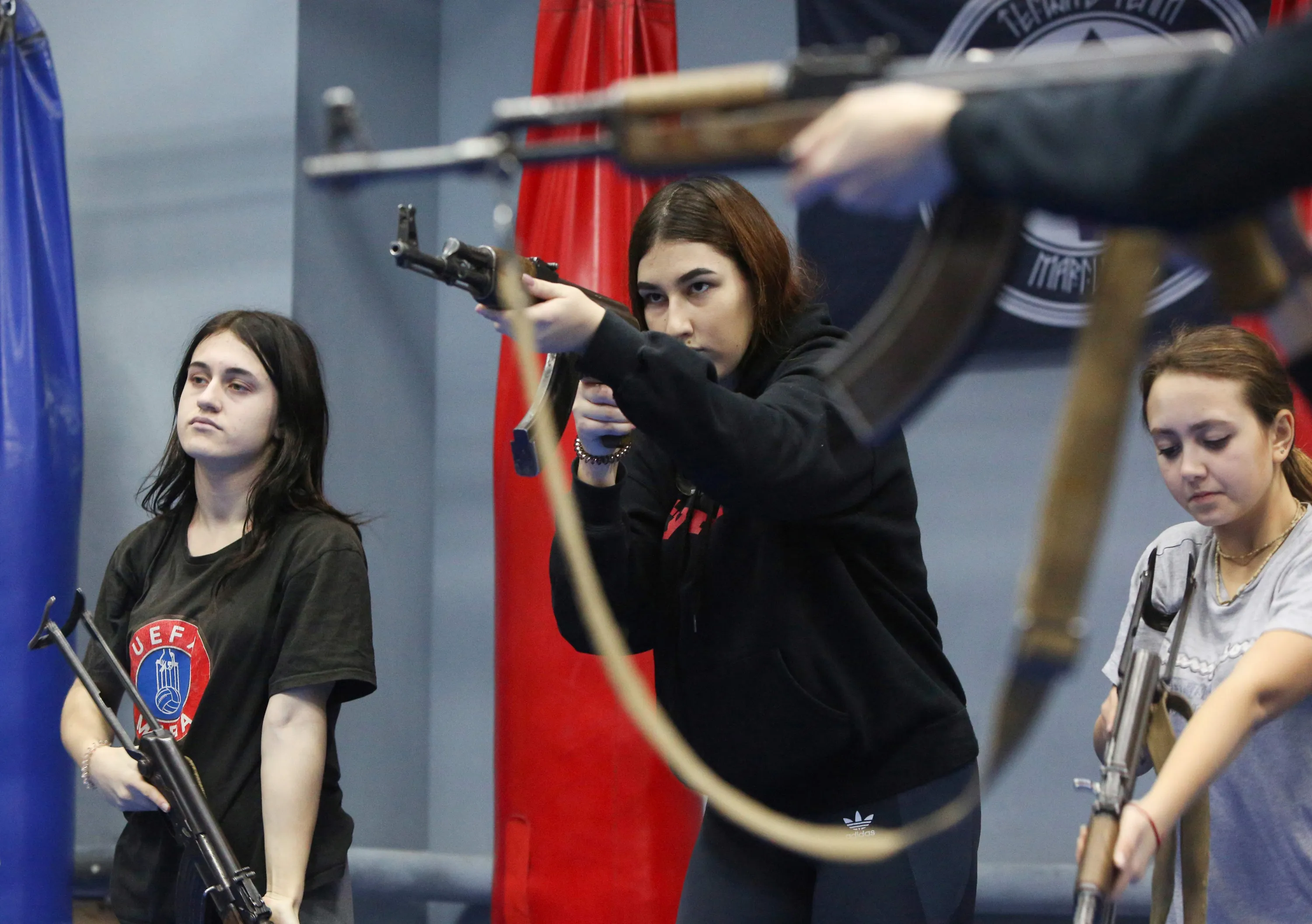 Ukrainian women and girls take part in a two-hour session to learn gun handling basics and hand-to-hand combat at a shopping mall in the Ukrainian city of Mariupol on January 26, 2019. Training in handling firearms is part of the self-defense courses for women that were established last year due to war that goes on in Ukraine's separatist east. Courses that are called “White Angels” and are totally free were organized by police officers and former soldiers who fought against Russia-backed rebels in about 20 kilometres (12 miles) from Mariupol. (Photo by Aleksey Filippov/AFP Photo)