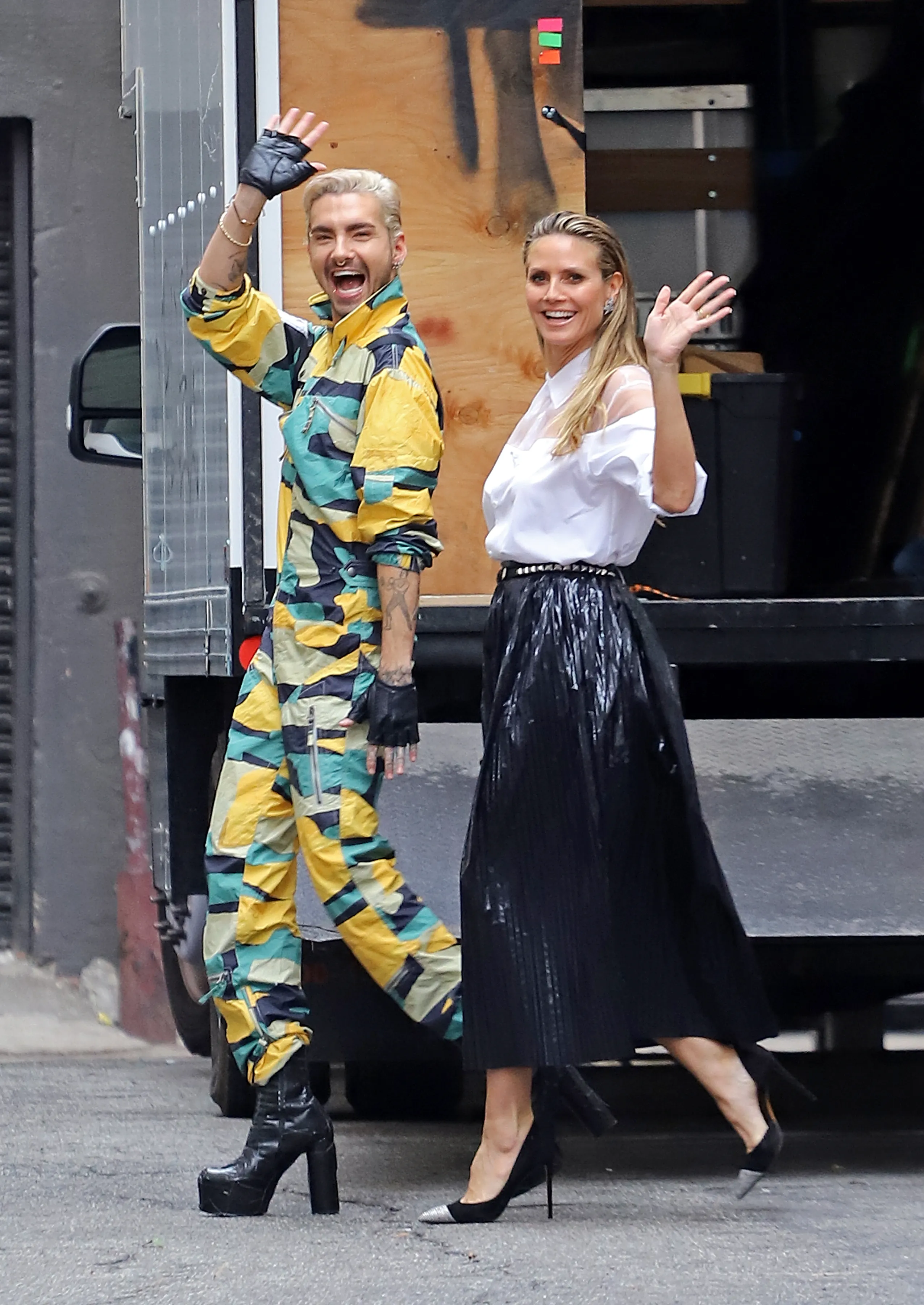 Heidi Klum and future brother-in-law Bill Kaulitz stay in high spirits as they brave the rain to film scenes for Germany's Next Top Model in Downtown LA on February 13, 2019. Heidi Klum stayed bundled in a giant creme fur-coat, umbrella and a can of Coke showing off her huge sparkling engagement ring from Bill.s twin brother and band-mate Tom Kaulitz. (Photo by Splash News and Pictures)