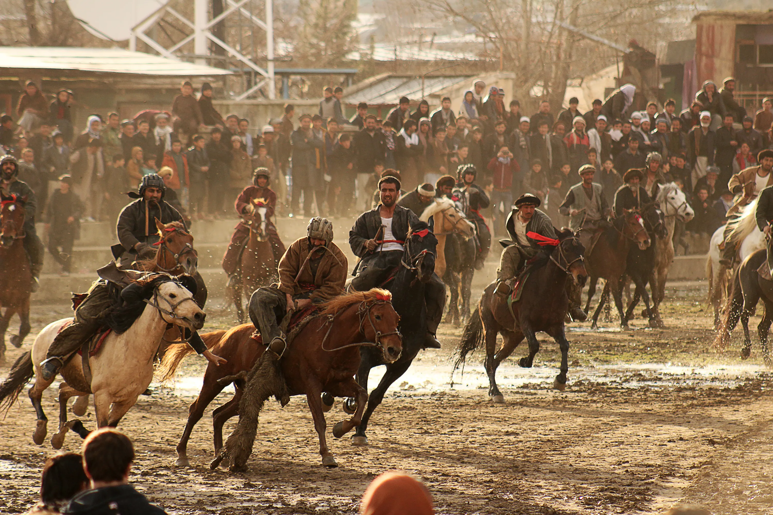 In this photo taken on February 19, 2018, Afghan horsemen compete during a game of the traditional sport of Buzkashi, in Badakhshan province. The ancient game of Buzkashi is an Afghan national sport which is played between two teams of horsemen competing to throw a animal carcass into a circle. (Photo by Sharif Shayeq/AFP Photo)