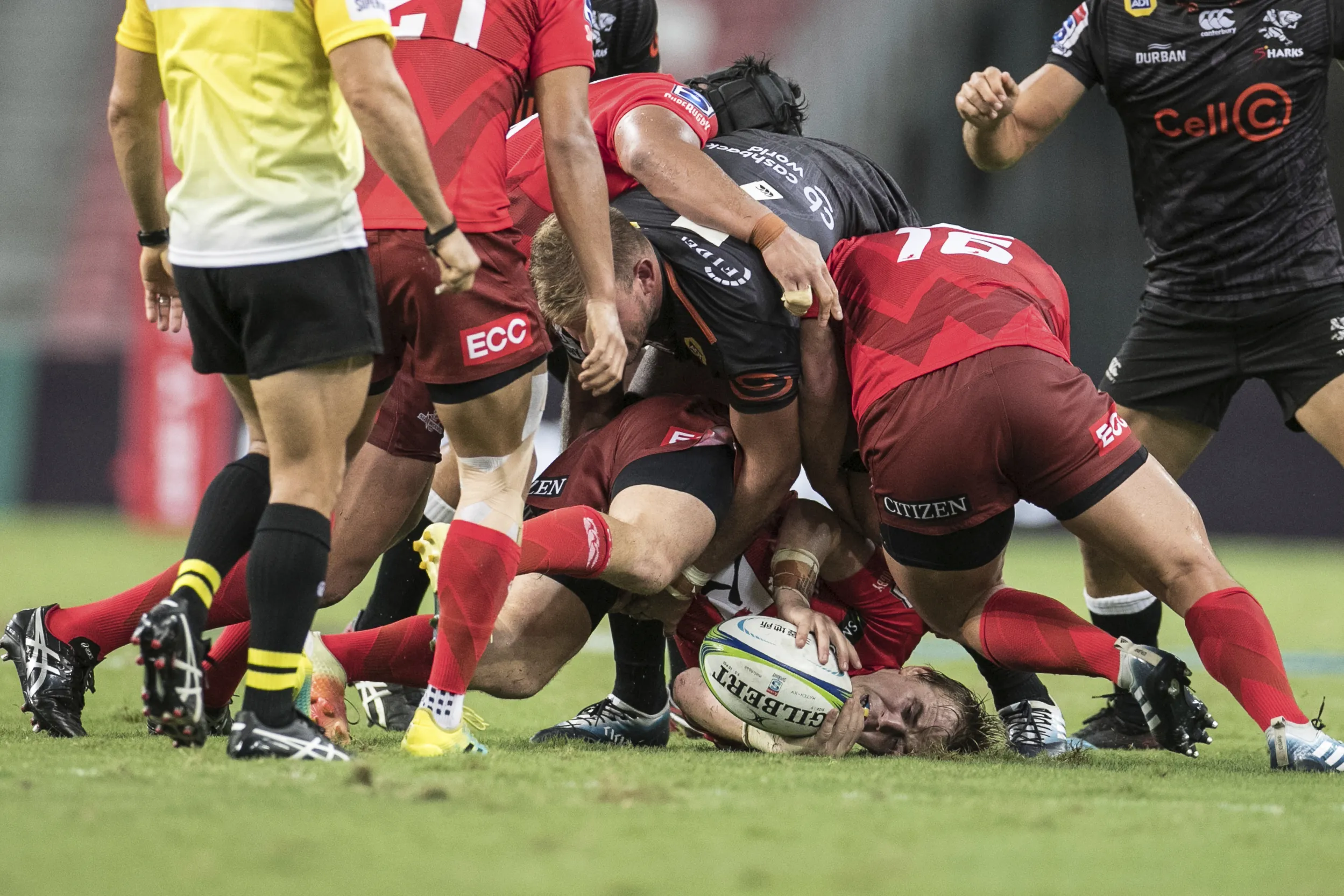 Hayden Parker of the Sunwolves gets tackled by Tyler Paul of the Sharks during the Super Rugby match between the Sunwolves and the Sharks at Singapore National Stadium, in Singapore, Saturday, February 16, 2019. (Photo by Danial Hakim/AP Photo)
